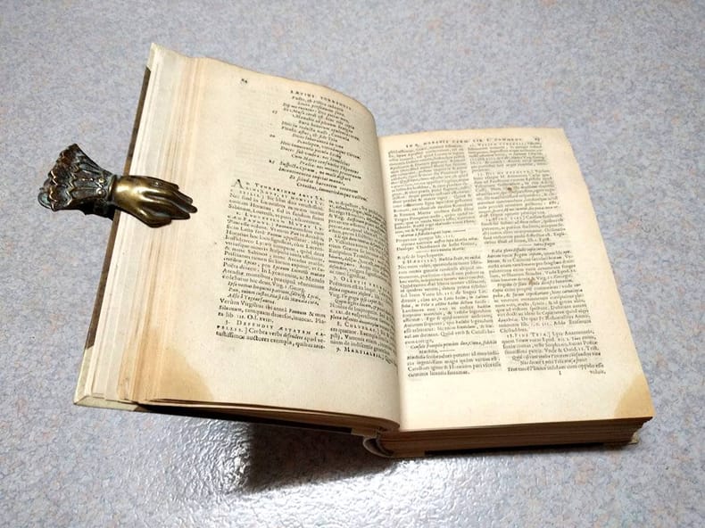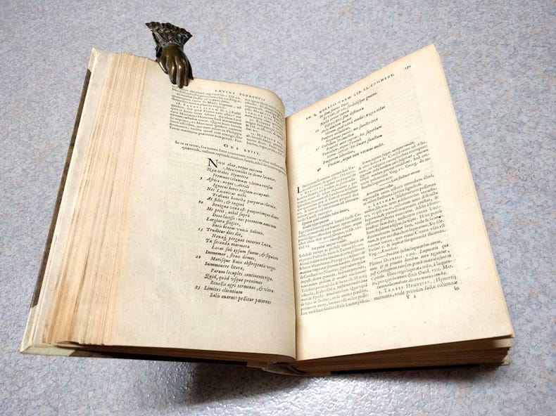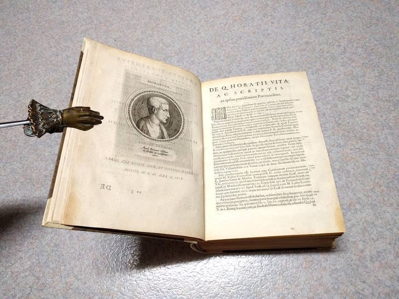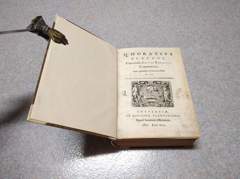 4to. (XX),839,(1 blank),(46 index) p. (2 engraved portraits, of Torrentius and Horace) Modern half vellum 26 cm (Ref: STCV:6607438; Schweiger 2,401: 'Commentar zeichnet sich durch Kenntniss der Grammatik'; Dibdin 2,97; Moss 2,14: 'A very beautiful and critical edition'; Ebert 10175: 'some of his corrections are very happy'; Fabricius/Ernesti 1,410: 'Cum erudito commentario Laevini Torentii, bonis Codd. MSS. usi') (Details: Modern and modest binding, antique style. Engraved printer's mark on the title, motto: 'Labore et Constantia'. Engraved portrait of Torrentius after Gisbert Venius, beneath the portrait 2 distichs by the Antwerp Neolatin poet Johannes Bochius (Jan Boghe); engraved portrait of Horace. Woodcut initials) (Condition: Title slightly soiled; ownership entry on the title; right lower corner faintly waterstained) (Note: The works of the Roman poet Quintus Horatius Flaccus, 65-8 B.C., have enjoyed a continuous presence in European culture. Till well into the 20th century he stood central in school curricula. Earlier, in the Middle Ages, he was next to Vergil the most important school author. Horace is transmitted in around 300 medieval manuscripts. The Renaissance saw the beginning of a flood of editions. 'For Neo-latin poetry until modern times, and for all the vernacular literature of Europe from the 16th through the 18th centuries, Horace provided the dominant model both for private lyrics celebrating wine and love and for public lyrics celebrating affairs of state'. Young poets used Horace to learn the trade. 'Horace's elegant rationalism and moral wisdom, and also his disabused and tolerant tone, made his poems favorite reading during the Enlightenment'. (The Classical Tradition, Cambr. Mass., 2010, p. 454/60) The humanist scholar Laevinius Torrentius, or in Dutch Lieven van der Beke, the editor of this 1608 edition, was appointed bishop of Antwerp in 1576. He was not only a theologian, but also a philologist, a combination, prelate and scholar, which was not rare in the Renaissance. In his youth he contributed to an edition of Varro's 'De Lingua Latina', Rome 1554. And in 1578 he published with Plantin a valued edition of the Roman historian Suetonius with his commentary. In a letter to Muretus Torrentius declared that his edition with commentary of Horace was ready in 1580, soon after the Suetonius, but that the war between the Spaniards and the Dutch republic was an obstacle for publication by Plantin. Later (1587) he wrote in a letter that the work on Horace was done, except for a commentary on the 'Ars Poetica'. Torrentius' Horace was posthumely published by the successor of Plantin, his grandson Balthasar Moretus, in 1608. For the lacking part, the 'Ars Poetica', the publisher used the text and commentary which had been produced by Petrus Nannius, 1500-1557, born in Alkmaar, and later also rector of the Latin School of that city. In 1539 he came to Leuven to teach on the 'Collegium Buslidianum'. His inaugural lecture there was on the 'Ars Poetica' of Horace. In the preface to the text of the 'Ars Poetica' in the 1608 edition (p. 767/68), written by Valerius Andreas, 1588-1655, we are told that a text and a commentary of the 'Ars Poetica', which had been produced in Leuven by Nannius, never saw the light, and that he edited Nannius' work (digessi et recensui), after having received a copy through the kind offices of his teacher Andreas Schottus, a Jesuit and humanist friend of Torrentius, to complete the edition of Torrentius. Andreas was a student at the same Collegium where Nannius had taught some 50 years before. Torrentius was also an accomplished neolatin poet, be it that his poetry is predominantly religious. His laudatory hymn on Balathasar Gerards, who murdered the protestant Prince of Orange, the Dutch 'Pater Patriae', in 1584, made him notorious in the Netherlands) (Provenance: In ink on the title: 'Bibliothecae Augustin: Angiae comparavit L. De Hou.. ....... , 1710'. This book, bought in 1710, originates probably from the library of the 'Schola Latina', founded by Augustine monks in 1537 in the Flemish city Edingen, nowadays the Walloon municipality Enghien, located in the Belgian province of Hainaut. The Roman name of the town was 'Angia'. The school, 'Collège Saint-Augustin' still exists. (See: moncollege.be/histoire.html)) (Collation: *-2*4, 3*2, A-Z4, a-z4, Aa-Zz4, AA-ZZ4, aa-nn4 (leaf nn4 verso blank), A-F4 (minus leaf F4, a blank)) (Photographs on request) (Heavy book, may require extra shipping costs) [