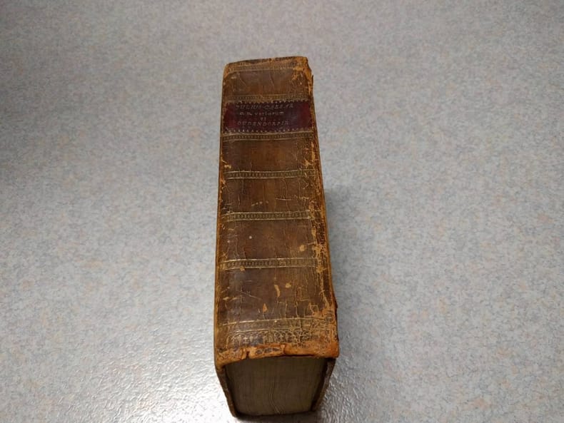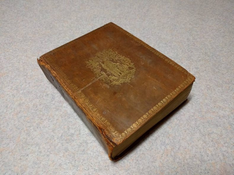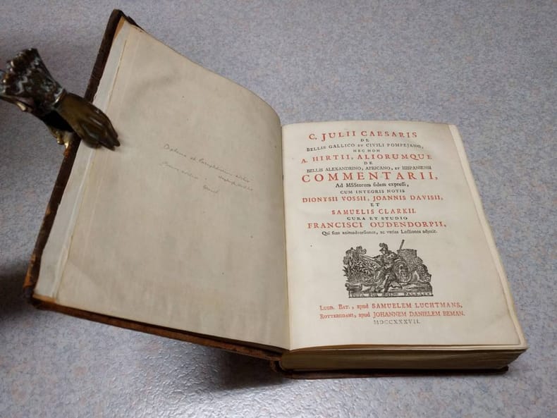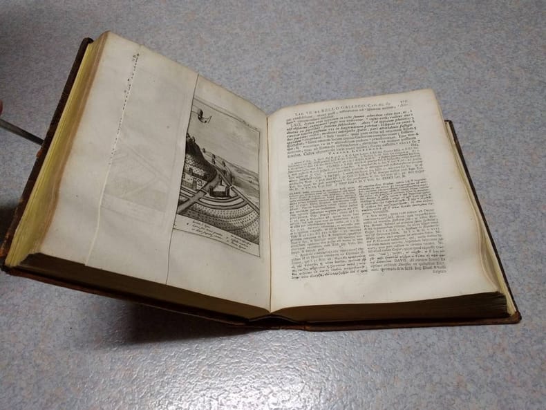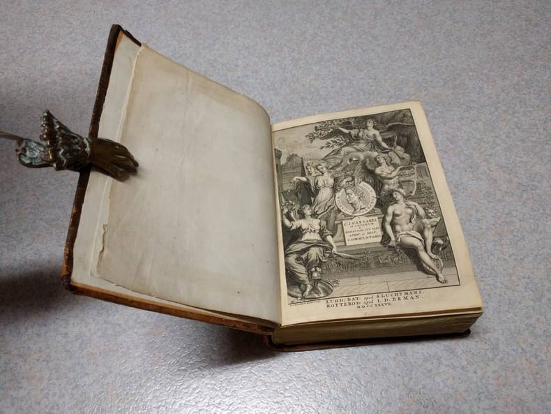 4to. 2 volumes in 1: (XXVIII, including a frontispiece),1035,(33 index) p., portrait of Caesar, 3 folding maps, and 10 (folding) plates. Calf 25 cm. <Fundamental> (Ref: STCN ppn 189161027; Neue Pauly, Suppl. 2 p. 129; Schweiger 2,46/47; Dibdin 1,363: 'An admirable and truly critical edition'; Brunet 1,1456/57; Moss 1,236; Fabricius/Ernesti 1,264; Graesse 2,8; Ebert 3282; Spoelder p. 642/43, Middelburg 4) (Details: Prize copy, without the prize. Backstrip adorned by gilt rolls. Red morocco shield in the 'second compartment'. Boards with gilt palmette borders, and the gilt coat of arms of Middelburg in the center. The allegoric frontispiece is designed and executed by F. van Bleyswyck, in the middle a kind of monument with the portrait of Caesar; in front of this monument sit 2 women, one of them is winged; they hold between them broken shackles; right of the portrait a winged male with a flame on his head, holding a roll with a floor plan, and also 2 women, one of them is holding a pyramide in her right arm and a crown in her right hand; this crown hovers above the head of Caesar; another woman, who holds a 'cornu copiae' flings coins; above this scene Fama, who blows her trumpet. Title printed in red and black. Woodcut Luchtmans's printer's mark on the title, motto 'Tuta sub Aegide Pallas'. A map of the Roman empire, Gallia and Hispania) (Condition: Binding worn at the extremities. Back scuffed, boards scratched, corners bumped. Wear to the front joint, which is splitting near the head and tail. New endpapers. Bookplate on the front flyleaf. Right lower corner of ca. 12 p. slightly waterstained. Paper of the same corner partly slightly warped) (Note: Throughout the 17th and 18th century in Europe the Roman historian Julius Caesar, 100-44 B.C., remained central to the education of the sons of the elite who trained for public life. He figured as an exemplary military leader. The politician and then tyrant Caesar enjoyed popularity, but was however also controversial in Europe, that was torn apart by bloody religious and civil wars. His dictatorship remained problematic, though some justified his usurpation of power as the only way out of turmoils of the Roman republic. This solid and valuable edition of 1737, comprehending the commentaries of Vossius, Davis and Clarke, is a great step forward for the text of Caesar. It was produced by the Dutch classical scholar Franciscus Oudendorp, 1696-1761, and immediately eclipsed all preceding editions. Oudendorp was, according to Sandys, the last of the great latinists of his age. For the last 20 years of his life he was professor of Eloquence (Latin) and History at the University of Leiden. He published also indispensable editions of Apuleius and Lucan. 'His 1737 edition of Caesar reveals a concern hitherto almost unknown, with the collecting and sifting of large numbers of variants. He drew up a list of some forty codices that had been consulted (either by him or by others at his request). (...) Oudendorp made a valiant attempt to cope with many manuscripts, his being the first serious attempt at 'recensio'. Oudendorp's edition was so authoritative and had such an impact that, for over a hundred years, few scholars dared to tread in the same path'. (V. Brown, 'The Textual Transmission of Caesar's Civil War', Leiden 1972, p. 5) This period came to an end in 1847 with the first modern critical edition of Karl Nipperdey) (Provenance: Armorial bookplate of 'Van der Veen, Hondius' on the front flyleaf. Janna Carla van der Veen- Hondius, who died in 2010 in Oostkapelle, Zeeland, at the age of 81, was an honorary member of the Koninklijk Zeeuws Genootschap der Wetenschappen. She and her husband Pieter were the owners of the mansion Duinbeek at Ooskapelle) (Collation: pi1 (frontispiece), *4 (minus leaf *4); 2*-3*4, 4*2; A-3S4, 3T4 (3T2 + chi1 = title page volume 2), 3V-4C4, 4D4 (plusminus 4D4), 4E-4P4, 4Q4 (plusminus 4Q2), 4R-6S4, 6T2) Our copy has 2 cancels and a title to the second volume that the STCN copy does not mention) (Photographs on request) (Heavy book, may require extra shipping costs)