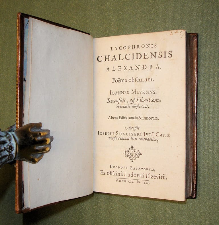 8vo. (XVI),350,(18 index) p. Calf (19th century) 16 cm (Ref: STCN ppn 15153098; Willems 39; Rahir 25; Berghman 835; Hoffmann 2,569; cf. Smitskamp, The Scaliger collection, no.93 for the first edition of 1597; Brunet 3,1247-1248; Ebert 12543; Graesse 4,309) (Details: Greek text and Latin translation. Back elaborately gilt with four ornamental lozenges. Brown letter label. Boards with a triple gilt fillet border, and gilt edges. Edges of the book block sprinkled. Marbled endpapers. The colophon on the last page reads: 'Lugduni Batavorum. Excudebat Ioannes Balduini. VIII. Kal. Maias. anno 1599') (Condition: Nice copy, some slight wear to the extremities, just a bit of rubbing to the joints. Some small, old ink marginalia. Last gathering slightly browning, otherwise a clean and fresh copy) (Note: Lycophron, 3rd cent. BC, was called to Alexandria in Egypt by King Ptolemaeus Philadelphos. There this tragedian wrote his 'Alexandra' (or Kassandra), ca. 1474 iambic trimeters, in which Kassandra tells about the fall of Troy, and the fates of the Greek and Trojan Heroes. It is his only surviving work, which is full of the extreme and designed obscurity that the Alexandrians, who were fond of a style full of learned allusions and playful riddles, loved. Rose calls the 'Alexandra' a monstruous riddle. 'In form it is the speech of a messenger, a servant of Priam, (...), coming to tell his master that Kassandra (= Alexandra) has just delivered a mysterious oracle. (...) The prophecy concerns the whole history of Troy, the Trojans and their descendants, together with the fates of the Greeks for many generations to come, and from beginning to end it calls nothing and no one by any wellknown name, personal or geographical'. (H.J. Rose, A handbook of Greek literature', London 1964, p. 336). For instance, Lycophron calls the mythical hero Heracles the 'Lion of the triple evening', expecting the reader to know that Heracles, when he was begotten, the night was thrice its normal length. This edition of 1599 is a revised and improved second edition. The first edition was produced two years earlier, in 1597, by the then 18 years old Dutchman Joannes Meursius, or in Dutch 'Jan van Meurs', 1579-1639. He was a student of the genius Joseph Justus Scaliger, born in 1540, who lectured since 1593 in Leiden, till his death in 1609. Scaliger helped and encouraged his pupil in the production of this edition. In the preface Meursius tells us that he wouldnot have dared to edit such a dark and difficult text without the help of Scaliger. Scaliger helped him with the commentary and gave him permission to reprint his verse translation, with corrections. This metrical and smooth Latin translation had been published previously in Basel in 1566. The last 251 pages of the book contain the commentary of Meursius, 'quod sine interprete vix est ut quisquam intellegat'. (preface, leaf A8 recto) Meursius was later appointed professor of History, and of Greek (1610/13) at his own university. He is best known for his editions of byzantine authors, and for the books he wrote on the history of ancient Greece, for example on festivals, Eleusis, and the antiquities of Athens and Attica. His work was widely used as source by later ancient historians. (Sandys 2,310/11)) (Collation: A-Z8 a8) (Photographs on request)