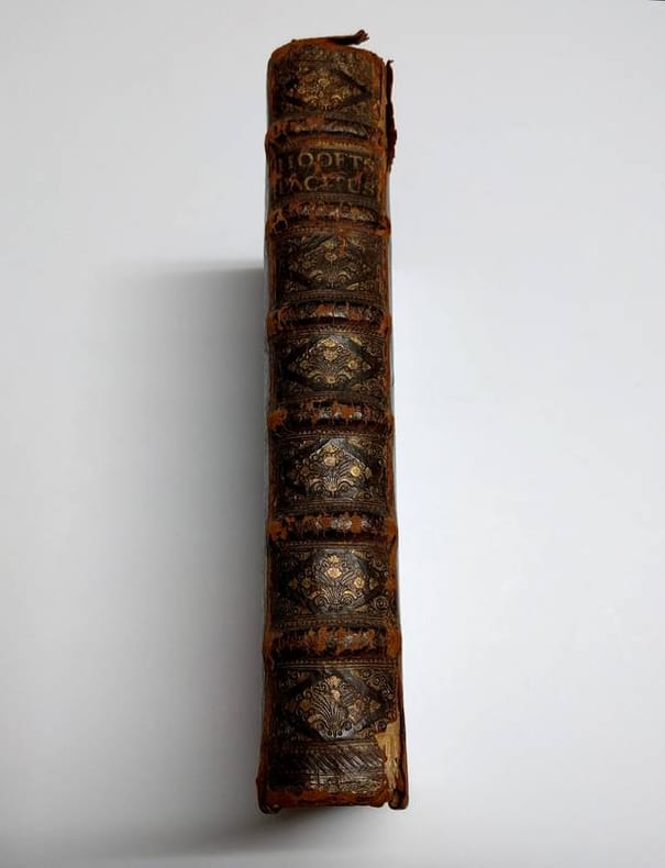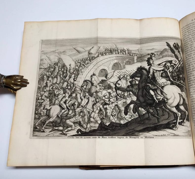 Folio. (XL),528,(4),11;(72) p., 14 engraved portraits & 8 folding historical plates. Calf 33 cm (Ref: STCN ppn 171376293; Geerebaert 137,5,II; OiN p. 359; Schweiger 2,1028) (Details: Back gilt and with 6 raised bands. Boards with double fillet gilt borders. Title in red & black. Woodcut printer's mark on the title, depicting Ceres and Flora under a palmtree (Boom means tree); the banner at their feet reads: I.V.S. A.W. H.D.B., which means: 'Johannes Van Someren, Abraham Wolfgangk, Hendrik en Dirk Boom'. Woodcut initials. 14 magnificent full-page portraits of Roman emperors engraved by A. Vaillandt, and 8 double-page battle and rural scenes engraved by I. Mulder) (Condition: Binding scuffed and scratched. Back rubbed and damaged at the head and tail. Corners bumped. Front pastedown stained, slightly damaged and with a bookplate. Faint name on the front flyleaf, small hole in somewhat soiled front flyleaf. Interior fine) (Note: The Dutch Renaissancist poet, playwright and historian Pieter Corneliszoon Hooft, 1581-1647, may be considered the founder of the literature of Holland's Golden Age. His style is not easily accessible, and often shows a sentence structure derived from Latin. Around 1630 he started with his translation into Dutch of the works of the Roman historian Tacitus, 56-117 A.D. These translations of the 'Annales', 'Historiae', 'Germania' and the 'Agricola' were posthumely published in 1684 by his able biographer Geeraert Brandt, 1626-1685. Hooft, in who the genius of Tacitus had arisen, according to Brandt, was not satisfied with the previously published translations, and decided to make a translation of his own which suited the style of the Roman historian better. Hooft however never found time to publish his translation. In the preface Brandt tells that the manuscript with the translations came into his hands by chance, long after the death of Hooft. He then decided to rescue them from oblivion, and to publish them, more than 50 years after Hooft had begun to translate Tacitus. In the same year the firm of Boom brought also a cheaper and smaller quarto-edition on the market. According to Geerebaert, this folio-edition was printed first) (Provenance: On the front pastedown a woodcut bookplate of J.J.A. Poley and F. Poley-Scheele, made by the Dutch graphic artist Johan Melse (See: Johan Schwencke in 'Den Gulden Winckel 31 (1932), p. 29-30) Johannes Adriaan Poleij, 1889-1951, married Francina Scheele, born 1891, in 1915 in the Dutch city of Goes) (Collation: (a)-(c)4, (d)-(g)2; A-3N-4, 3O-6, 3P-3S4, 3T6, 3V-3X4; A-S2 (leaf S2 verso blank)) (Photographs on request) (Heavy book, may require extra shipping costs)
