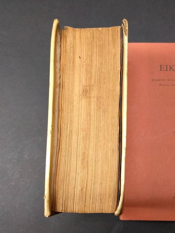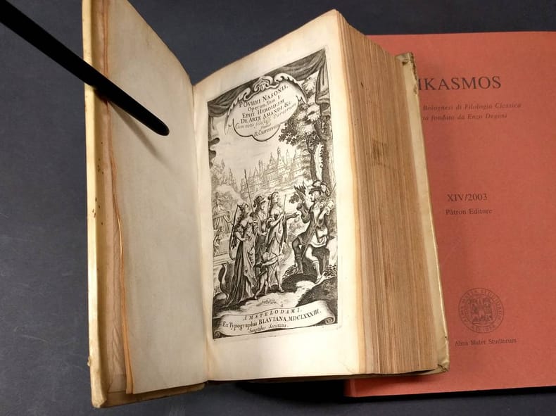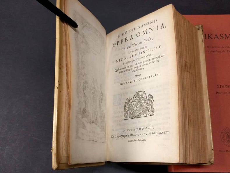 8vo. (XVI),832,(14 index),(2 blank) p., One portrait of Ovid. Vellum. 20 cm (Volume 1 of 3) (Ref: STCN ppn 852573480; Schweiger 2,631: 'Bloss Wiederholung der Ausgabe von 1670'; Brunet 4/272: 'Cette édition est belle, et les notes en sont plus et mieux choisies'; Dibdin 2,267/8: 'Yet (of the Variorum editions) that of 1683 is perhaps the general favourite'; Graesse 5,70; Ebert 15368; Rahir 2784, 'Annexes de la Collection Elzevirienne') (Details: Volume 1 of 3 only. One engraved portrait of Ovid. Engraved frontispiece, depicting the Judgment of Paris; in the foreground Amor and a peacock, in the background Troy. This volume contains the Latin text with extensive commentary of the 'Heroides' (p. 1/308), 'Amores' (p. 309/510), 'Ars Amatoria' (p. 511/680), 'Remedia Amoris' (p. 681/738), the fragment 'Medicamina Faciei' (p. 738/748), 'Halieuticon' (p. 749/760), 'Consolatio ad Liviam' (p. 761/793), and 'Nux' (p. 793/806); at the end have been printed 3 verse epistles, each written in the person of a legendary woman to her absent lover, forged by the Italian humanist and impersonator of Ovid, Angelo Sabino, or Angelus Sabinus, floruit 1460/1480. The 3 hoax poems were for a long time attributed to Aulus Sabinus, a friend of Ovidius) (Condition: Binding age-tanned. Upper corner of back cover damaged. This is volume 1 of 3 only) (Note: The Roman poet Ovid, 43 B.C. - 17 A.D, 'is perhaps the most consistently influential and popular writer of the classical tradition. His central position is suggested by the many surviving manuscripts of his works and their early publication in printed editions. (...) Most would agree that it is his Metamorphoses that has had the greatest influence, but his other major poems, the Heroides, Tristia, Fasti, and particularly his racier works, the Amores, Ars amatoria, and Remedia amoris, have played their part in maintaining his reputation as a writer of enduring importance and appeal'. (The Classical Tradition, Cambr. Mass. 2010, p. 667) Ovid was widely read in antiquity, and remained to be read at the Carolingian court in the Middle Ages. Ovid became also the favourite poet of the Renaissance. Boccaccio and Petrarca were influenced by him. Shakespeare was inspired more by Ovid than by Vergil. (Neue Pauly 9,110/119) The huge number of editions and translations suggests that Ovid's appeal lies also beyond the bounderies of the scholarly and literary world. A new age (1658-1837) dawns in the textual history of Ovid's poems with the work of the famous Dutch scholar, neolatin poet and diplomat, Nicolaas Heinsius, 1620-1681, 'who, after 345 year, remains the central figure in any account of the editing of Ovid. No modern editor will fail to mention his name in the preface as the 'sospitator Ovidii; no 'apparatus criticus', will fail to cite his numerous contributions to the improvement of the text'. (P.E. Knox (ed.), 'A companion to Ovid', Chichester 2013, online version) Heinsius' editions of Ovid offer texts that are based on an extensive first hand knowledge of the manuscripts, and that are supplemented with a full textual commentary which records and discusses 'variae lectiones', and notes alterations of the vulgate text. (Sandys 2,323/6) Our edition of 1683 is a reissue an an edition of 1670, published in Leiden. It is a so-called 'Variorum' edition. Such an edition generally offers a 'textus receptus' which is widely accepted, accompanied with the commentary and the annotations of various specialists, taken, or excerpted from earlier useful, normative or renewing editions. Editions like these were useful, but never broke new ground. This Variorum edition was produced by the Dutch classical scholar of German descent Bochardus Cnippingius, 1623/24-1674. At the age of 23 or 24 he was appointed Rector of the Schola Latina at Culemborg. He gave up this position and moved to Leiden to teach classics at the local 'Schola Latina', later he became Conrector. Cnippingius' edition was the main source for the Ovid translation of the English poet John Dryden. (J.A. van der Welle, 'Dryden and Holland', Groningen 1962, p. 122/24)) (Collation: *8, A-3G8 (leaf 3G8 blank)) (Photographs available on request)