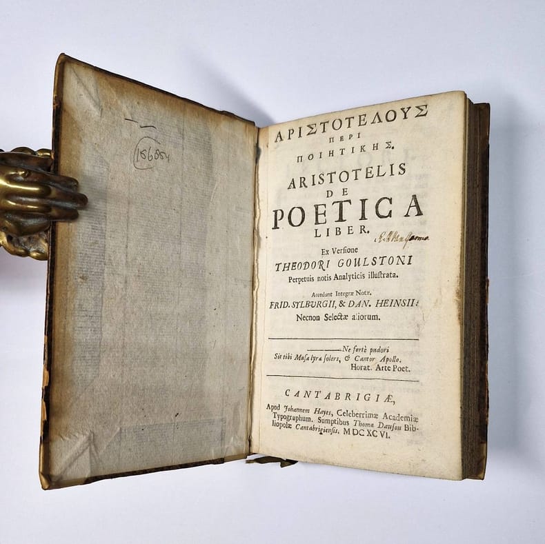 8vo. 2 parts in 1: (XX),101,(3),104,(12 index, errata) p., folding table. Half vellum. 17 cm (Ref: Hoffmann 1,283; Cooper/Gudeman 44 & 174; Schrier p. 36; Brunet 1,477; Moss 1,122; Graesse 1,214; Ebert 1191; ESTC R14743) (Details: The work consists of two parts, each with its own title page; the first contains the Greek text and commentary, the second the Latin translation and analytical notes. Short title in ink on the back. The folding plate shows a 'Synopsis libri Poeticae' ) (Condition: Binding somewhat used. Vellum age-tanned. Vellum on the back slightly soiled. Front flyleaf removed) (Note: 'The influence of Aristotle, 384-322 BC, on Western intellectual life is immense, so much so that once one begins to track it, no field of inquiry can be identified that it would be safe to overlook. Aristotle laid the foundations for not one but two sciences, logic and biology, an achievement unmatched by any thinker before or since'. (The Classical Tradition, Cambr. Mass. 2010, p. 70) For centuries his authority guided the further development of some of the sciences. From the 16th century to the age of Romanticism Aristotle's views, developped in his 'De arte poetica', played a dominant role in the theory and practice of European literature, especially of drama. And with Jacob Bernay's 'Grundzüge der verlorenen Abhandlung des Aristoteles über Wirkung der Tragödie' (1857), who rejected the moral (Lessing) and aesthetic (Goethe) tradition of 'catharsis', and who introduced the concept of the intentional arousal and discharge of emotions, to the discussion, Aristotle's description of the effect of tragedy as a 'catharsis', (cleansing, or purgation) of tragic emotions (pity and fear) 'became the focus of a debate on the purposes of literature which attracts contributors up to the present day'. (O.J. Schrier, 'The Poetics of Aristotle and the Tractatus Coislinianus, a Bibliography from about 900 till 1996', Leiden, 1998, p. 1) (Nietzsche, Freud, Wagner, Wilamowitz-Moellendorff et 'multi alii' followed). Aristotle's 'De poetica liber' is 'the only piece of technical writing from antiquity that still plays a role in scholarly discourse. If Aristotle had confined himself to discussing Greek poetry from the viewpoint of its formal aspects or its historical development, his work would still have been of eminent importance, but only for classicists and historians of literature. He did more, however, laying bare what in his view are the fundamentals of poetry, giving his criteria for distinguishing literary genres, and pointing out along which lines he thought these and the works of individual poets should be evaluated. In pursuing these targets, he formulated insights that have been thought to be applicable even to modern narrative genres like the detective story and the film. These aspects of the Poetics make it an interesting starting-point for discussions in wide areas of modern literary theory'. (Idem, Ibidem) This edition of 1696 is a revision of Goulston's 'De Poetica' edition of 1623. It was edited in 1696 by the English schoolmaster James Upton, 1670-1749, once a fellow of King's College at Cambridge. Upton udated the work of 1623, making better use of the 'De Poetica' edition of the Dutch scholar Daniel Heinsius (Leiden 1610/11, and 1643), and of the Aristotle edition of the German scholar Friedrich Sylburg, who provided not only notes, but also the Greek text for this edition (Frankfurt 1584/87, volume 2). Upton added, he tells in the preface, also material he found in various authors, among whom Samuel Petit's 'Leges Atticae' (Paris 1635) and Daniel Heinsius' 'De tragoediae constitutione' (Leiden 1611), and André Dacier's French translation of the Poetics (Paris 1692). Upton also consulted Du Val's Aristotle edition (Paris 1619, 1639). He also revised Goulstons Latin translation) Theodor Goulston, 1576-1632, studied in Oxford, and was a medical doctor in London. His Poetics edition was reissued in 1696, 1728, 1731, 1745 and 1780. In 1619 Goulston had already published in London 'Versio Latina et Paraphrasis in Aristotelis Rhetoricam' (See his Wikipedia article) (Collation: Ad 1: *2, A-O8, P4, Q2. (Folding table after leaf before A1)) (Photographs on request)