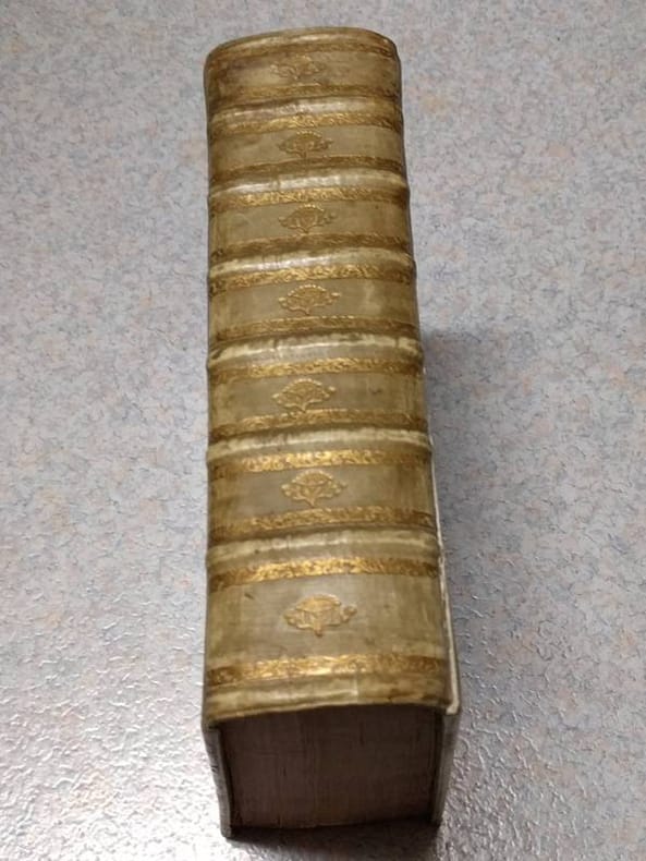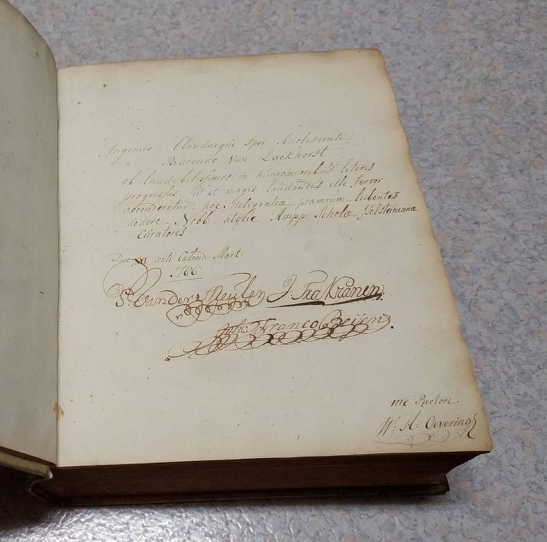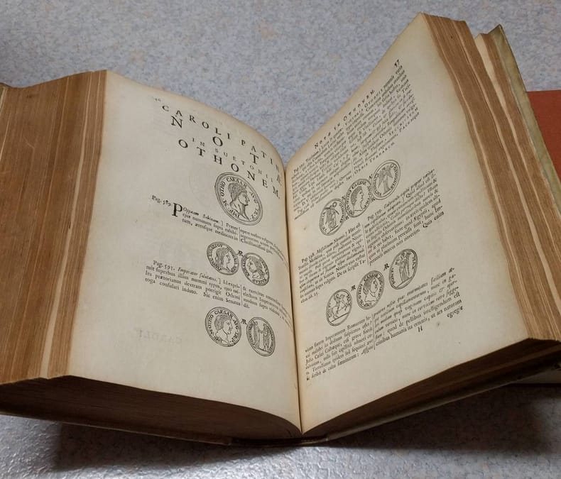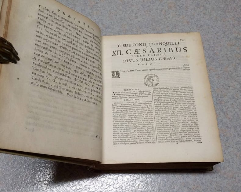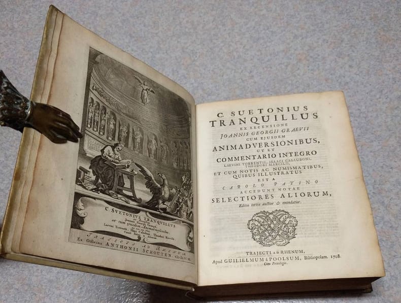 4to. 2 parts in 1: (XVI),829 (recte 807),(1 blank); 79,(4 index),(1 blank); 110,(153 index),(1 blank) p. Frontispiece. Vellum. 24 cm 'Prize copy with the manuscript prize' (Ref: STCN ppn 203443551; Schweiger 2,979; Ebert 21933; cf. Moss 2,631; cf. Dibdin 2,441; cf. Fabricius/Ernesti 2,458/59; Brunet 5,582; Spoelder p. 711, IJsselstein 2) (Details: Back with 5 raised bands. Binding gilt, and with the gilt coat of arms of IJsselstein on the boards. Including the prize. The frontispiece, dated 1703, depicts Suetonius at work at a desk in what looks like the Pantheon. Woodcut ornament on the title-page. Numerous woodcut illustrations of medals and coins in the text) (Condition: Vellum soiled and age-toned. All 4 decorative silk fastening ribbons worn away. Paper yellowing) (Note: The editor of the Suetonius edition is Johann Georg Graeve, or in Latin Johannes Georgius Graevius, 1632-1703. He was professor of Eloquence at Duisburg, from 1657 at Deventer and from 1661 at Utrecht, where he lived and worked for the last 40 years of his life. He limited his attention mainly to writers of Latin prose, Cicero, Suetonius, Caesar, Justinus, Florus. This scholar of international stature is remembered above all for his 'Inscriptiones antiquae', long time a standard edition. He is also famous for his three 'Thesauri', in which important works of previous leading scholars were collected and reprinted, the 'Thesaurus eruditionis scholasticae', the 12 folio volumes of the 'Thesaurus antiquitatum Romanarum', and the 9 volumes 'Thesaurus antiquitatum et historiarum Italiae'. Graevius produced 3 Suetonius editions, the first appeared in 1672, his second in 1691 and finally a third in 1703. This title on offer of 1708, is a reissue of the edition of 1703. Van Poolsum apparantly acquired the unsold copies of the 1703 edition, replaced only the first 2 leaves, and brought it again on the market under his own name. The text of Suetonius (the 'Vitae', 'De illustribus grammaticis liber' and 'De claris rhetoribus liber') is followed by 14 pages and 2 folding tables with inscriptions to illustrate the 'Lives', and 54 pages with the commentary of Graevius; then follows the commentary of 79 pages by Carolus Patinus, with nice illustrations of coins. This is followed by a 70 p. commentary of the Dutch scholar Theodorus Marcilius on Suetonius' biography of Vespasian. This is again followed by a small section with the prefaces to Suetonius by Politianus and Casaubon, and Vossius' article on Suetonius from 'De historicis Latinis'. Included is also the text of the 'Monumentum Ancyranum', with Isaac Casaubon's commentary; at the end a 153 page index compiled by Matthias Berneccerus Graevius inserted, as mentioned above, the entire commentary of Carolus Patinus, or Charles Patin, 1633-1693. In 1676 this Frenchman was appointed professor of philosophy at the university of Padua, and later of medicin and surgery. He made his fame however with his books on numismatics, and became a well known authority upon the subject of coins and medals. He published on Roman families and emperors on coins and medals. He possessed a collection of his own, because in Amsterdam in 1672 was published on his own expense his 'Thesaurus numismatum e Museo Caroli Patini'. (Handbuch Gelehrtenkultur der frühen Neuzeit, Berlin 2004, vol. 1, p. 497/8) Patin must also have been a wealthy man, because his own Suetonius edition of 1675 (Basel), which seems to be a 'spin off' of his great knowledge of imperial coins, was also printed on his own expense. The Roman historian Suetonius, born c. 69 A.D, is the most influential and best known biographer in the Latin language. He was appointed secretary to the emperor Hadrian, a job that gave him access to the imperial records and archive. He made good use of his sources, writing the Lives of the XII Caesars, or 'De vita Caesarum'. The collection consists of the biographies of 12 emperors, from Caesar, the founder of the imperial line, to Domitian. 'Suetonius, like Plutarch, believed that a person's character could be revealed in small and insignificant details'. He 'organized his Lives by topics (per species) rather than chronologically'. (The Classical Tradition, Cambr. Mass. 2010, p. 912/13) Beyond simplicity and clearness he has no stylistic pretentions. He quotes verbatim from documents he knew, and shows critical ability. 'The great number of scurrilous anecdotes in most of the lives may be due to the nature of his sources'. (OCD, 2nd ed. p. 1020/1) Of another of his works, 'De viris illustribus', a collection biographies of famous Roman authors, the lives of Lucan, Horace, Vergil and Terence have survived, and his 'Liber de illustribus grammaticis', and his 'De claris rhetoribus liber'. Suetonius was read in the Middle Ages. The Frank Einhard wrote a biography of Charlemagne along the lines of a Life of Suetonius. From the Renaissance onward Suetonius was neglected. Pioneering work was done by the French scholar Isaac Casaubon, who produced an excellent text and a valuable commentary. (Geneva 1595/1615) This work was continued by the Dutch scholar Graevius with his great Suetonius edition of 1672. This edition became, with her numerous reissues and revisions, the foundation for the widespread study of Suetonius in the Netherlands and in England, and in the next (18th) century the scholarly interest in Suetonius has been greater than ever before or since. This edition of 1708 is a reissue of the 3rd augmented and corrected edition. It contains the entire commentaries of Torrentius, Casaubon, with the notes of the Dutch scholar Theodorus Marcilius (Arnheimensis) and other leading scholars. Gibbon praised Suetonius for his strict dedication to historical truth. Nowadays 'historians of Rome take him more seriously than do literary critics'. (The Classical Tradition, Cambr. Mass., 2010, p. 913)) (Provenance: The prize was awarded to the 15 years old Barend van Lockhorst, for his diligence and his progress in La