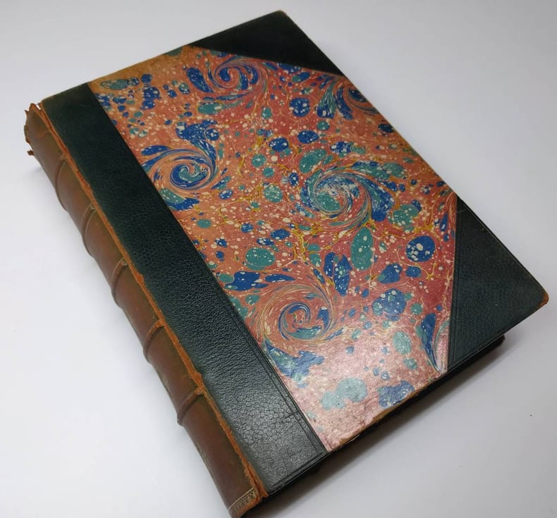 4to. numerous illustrations & plates and a map of Palestine. (IV),646 p. Half calf. 30 cm (Boards and back loose, because of broken hinges. Book-block in good condition. Head of the spine chafed, corners of the boards bumped. Some foxing. Colours on the map fading)