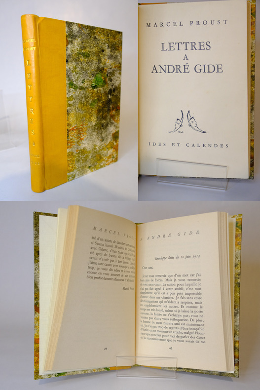 Neuchâtel et Paris Ides et Calendes 1949 121 pp. In-12. Relié. Très bel état. 1 volume. Édition en partie originale. Un des 49 exemplaires de tête numérotés sur Chine. Est joint une lettre autographe signée d'A. Gide à Richard Heyd, éditeur de l'ouvrage, le félicitant pour cette édition : "Je songe à la joie que Proust aurait eue" ; et une lettre autographe signée de Martin du Gard à Heyd réévaluant Balzac après la lecture de ces lettres de Proust à André Gide : "Je me persuade une fois de plus que Balzac n'est pas mon homme et je n'insiste pas. Je viens d'en faire l'expérience en relisant dans les Illusions la rencontre de Rubempré avec le prêtre espagnol ".Cette publication est relative à la publication de Du côté de chez Swann. Gide s'y excuse d'avoir refusé le volume et propose que la NRF publie les autres volumes de A la recherche du temps perdu.
