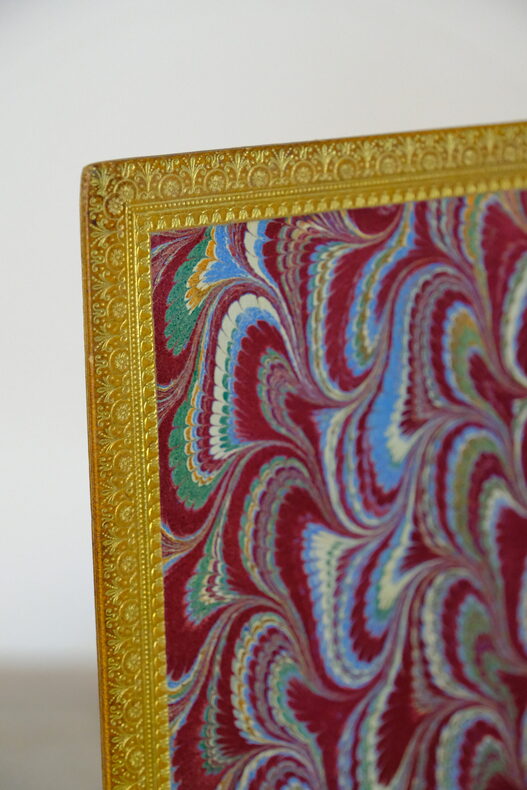 Paris, Alphonse Lemerre, 1878. In-8, 14 x 21 cm, reliure maroquin citron « à la Du Seuil » signée Lauscelin. Dos à nerfs ornés, titré et daté dorée. Sur les plats fleurons angulaires de roses dorées, grand fleuron monogrammé « M.A. ». Double filet sur les chasses et large dentelle à l’intérieur (gardes). Exemplaire numéroté sur papier de Chine, l’un des 50, celui-ci n°17. Monogramme de l’éditeur. Bonne conservation, 1er mors en partie fendillé, petit choc au coin inférieur du 2nd plat, légères taches foncées aux plats), rouseurs.