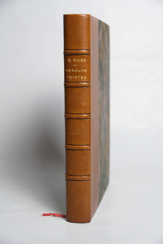 Paris Gallimard 1951 331 pp In-8 Relié Très bel exemplaire 1 volume ÉDITION ORIGINALE. Un des 15 exemplaires de tête numérotés sur papier de Hollande.10 ans avant que Roger Nimier n'écrase son Aston Martin DB4 contre un pont de la Celle-Saint-Cloud, Olivier Malentraide - le personnage principal des Enfants Tristes - en finissait déjà d'une manière étrangement similaire :"On a souvent vu dans la fin des Enfants tristes une forme de message, de signe, derrière l'humour et le dandy"Olivier lança la voiture à cent trente, brûlant les feux rouges, évitant de justesse des camions, des cyclistes. Après avoir roulé quelque temps à cette allure sur les boulevards extérieurs, i l trouva ce qu'il était venu chercher dans un grand chantier où l'on avait creusé des fosses profondes. Catherine est la plus charmante veuve de Paris.""Un livre à sa ressemblance, comblé de talent, de tristesse et d'ennui" écrivait Pierre de Boisdeffre dans la Revue des Deux Mondes.