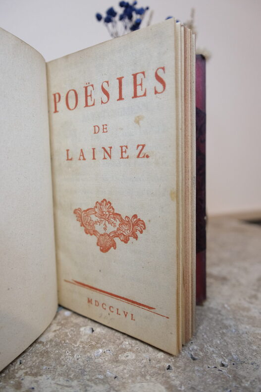 s.l, s.n, 1756. Petit ouvrage au format in-12, 10 x 16 cm, sous une reliure demi-maroquin à coins postérieure, dos orné d’un décor filigrané centre et coins, 5 nerfs, garde marbrée peignée. 110 pp. Reliure signée Petit, succ. de Simier. Sur la garde, on trouve un Ex-libris de la "Biliothèque Al. de la Fizelière". M. Albert Patin de la Fizelière fut un critique d’art et bibliographe française, notamment connu pour avoir publié la première bibliographie de Baudelaire (qu’il côtoya) un an après sa mort. Édition peu commune d’oeuvres poétiques de Lainez, imprimée plus de 40 ans après sa disparition. Le recueil de ces œuvres de lainez, ainsi que la transmission du manuscrit, sont attribués à M. Évrard Titon du Tillet. Elle regroupe un ensemble dont une bonne partie chante les plaisirs du vin et de la gastronomie. L’ouvrage nous met à disposition un recueil varié de poésies anacréontiques, de bouquets, d’épigrammes et autres chansons tendres et galantes. Le livre nous dresse également un bref portait de la vie d'Alexandre Lainez, qui constituent les rares informations disponibles au sujet de cet épicurien érudit ayant vécu sous le règne de Louis XIV et qui cotoya Chapelle et La Fontaine. Assez bonne conservation de l’ouvrage dans l'ensemble, épidermures sur les mors, coins émoussés.