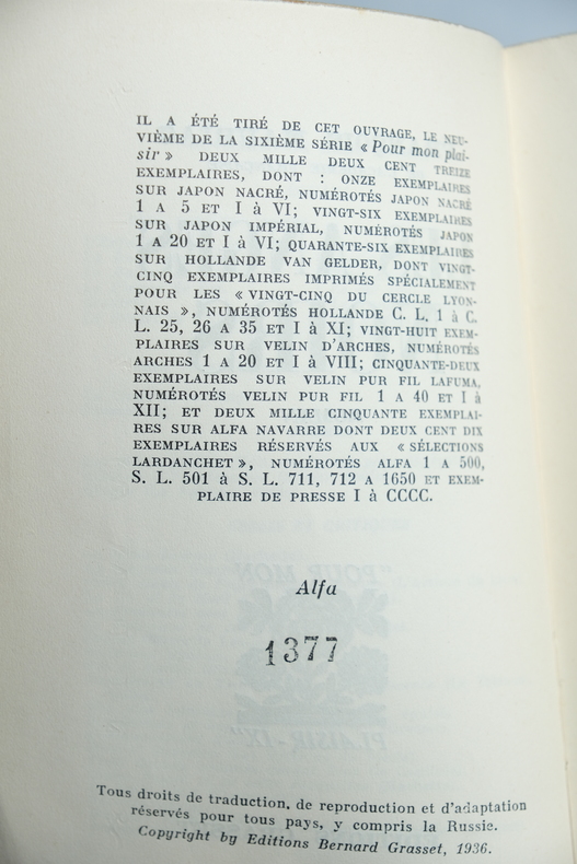 Paris, Grasset, 1936. In-12,, 12 x 19 cm, broché, couv. rempliée, 292 pp. Collection « Pour mon plaisir ». Édition originale, l’un des 2050 sur alfa. Très bonne condition, quelques rousseurs sur la couverture et sur la tranche de tête, intérieur très frais.