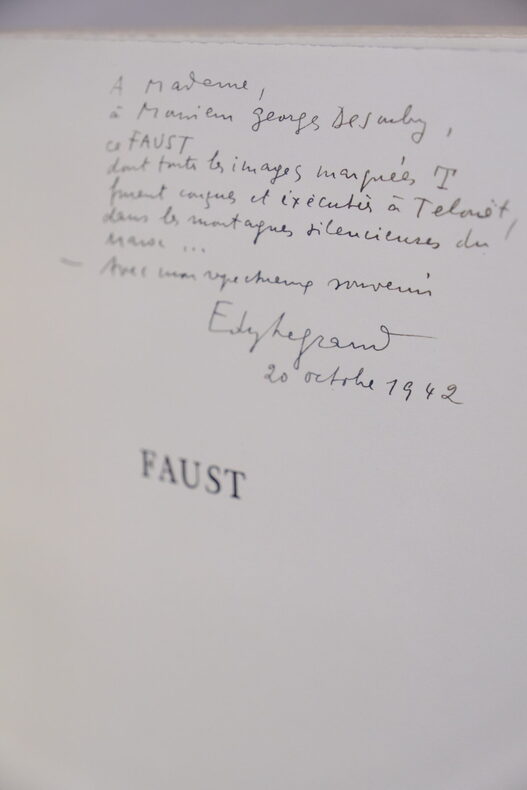 GOETHE (Johann Wolfgang von). Faust. Montpellier, Union latine d’éditions, 1942. Exemplaire enrichi d’un envoi autographe de l’illustrateur, Edy Legrand. 2 volumes in-8 brochés éditeur, édition illustrée par Edy Legrand. Tirage limité à 6000 exemplaires numérotés, celui-ci n°98, un des 2000 sur pur fil de Renage. Bonne condition, sans emboitage (l’édition était initialement fournie avec un emboitage cartonné d’un papier marbré similaire à la reliure).