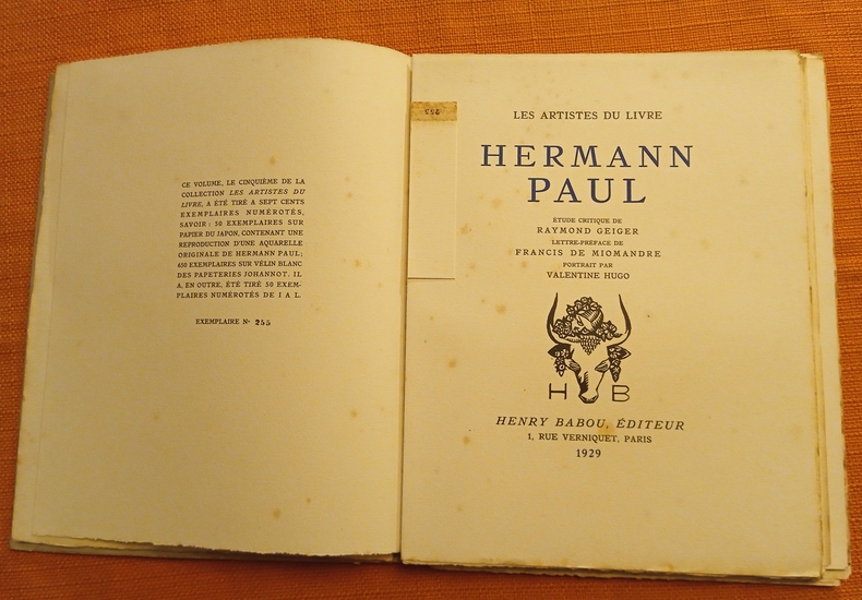 Etude critique de Raymond Geiger, lettre préface de Francis de Miomandre, portrait par Valentine Hugo. Cinquième volume de la collection "Les artistes du livre", tirage de 700 exemplaire, celui ci porte le numéro 255 des 650 exemplaires dur vélin blanc des Papeteries Johannot. Illustrations dans le texte, 12 planches hors texte. Portfolio sous chemise rempliée recouverte de papier cristal, partie texte de 53 p. non coupé, bon état, rousseurs assez éparses