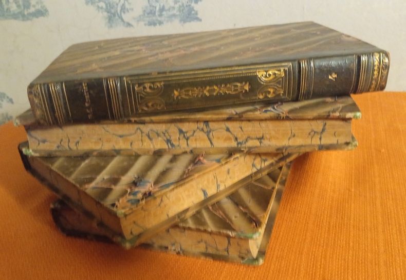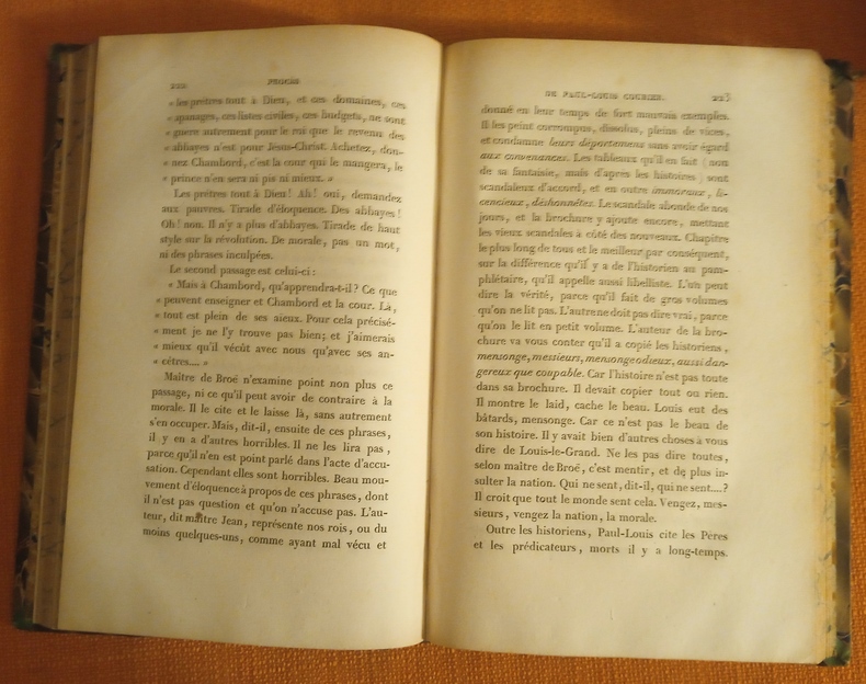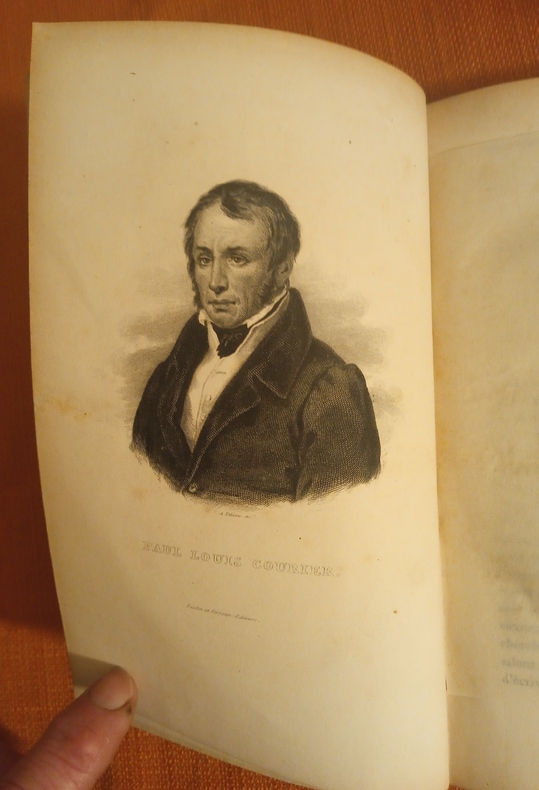 Portrait en frontispice au T. 1. Reliures demi basane d'époque de stule romantique, 4 faux nerfs, bon état, quelquues traces d'épidermures, coins émoussés, papier des plats, contre plats et premières gardes à la cuve, tranches à la suite, intérieurs en bonne condition, ombres de rousseurs, 458 p. , 448 p., 414 p. et 433 p. Paul-Louis Courier (1772-1825) fut le témoin attentif et railleur de son époque. D'éblouissante manière, il stigmatisa à travers ses lettres et ses pamphlets la petitesse des grands et rendit hommage à la grandeur des petits. Son style mordant et brillant, son indépendance d'esprit en font un auteur toujours d'actualité. Helléniste hors pair, cet ardent admirateur de l'antiquité traduisit aussi de nombreux textes grecs et notamment, pour la première fois dans son intégralité, Daphnis et Chloé de Longus. (source : paullouiscourier.fr, remarquable site qui lui est consacré)