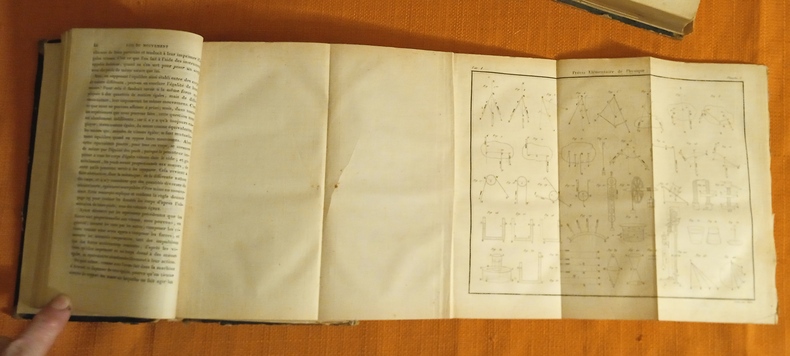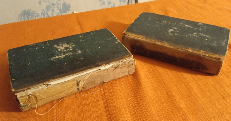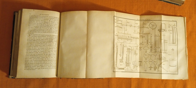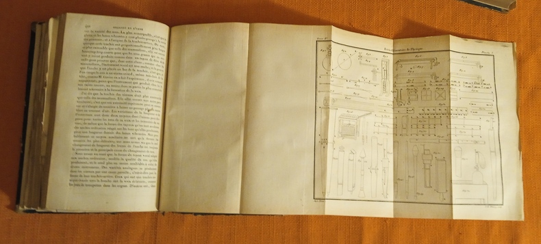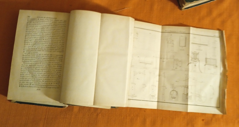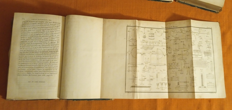 Les pages de faux titre indiquent douze planches en taille-douce mais il y a en réalité 6 planches dans le T. 1 et 8 planches dans le T. 2. Edition originale, intérieurs en bonne condition, uniformément un peu jaunis, rousseurs éparses. Le brochage a gardé son intégrité mais les reliures demi basane sont en très mauvais état, dos pratiquement manquants, plats presque entièrement désolidarisés. T. 1 : page de faux titre, page de titre , X p. d'avant-propos et 576 p. , T. 2 : Page de faux titre, page de titre, IV p. de table et errata du T. 2 et 608 p.
