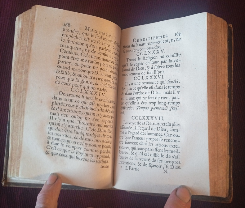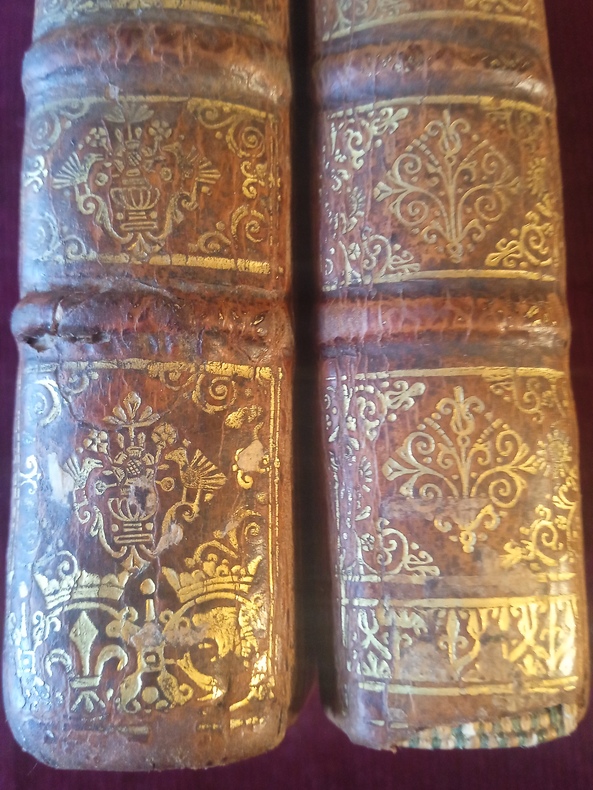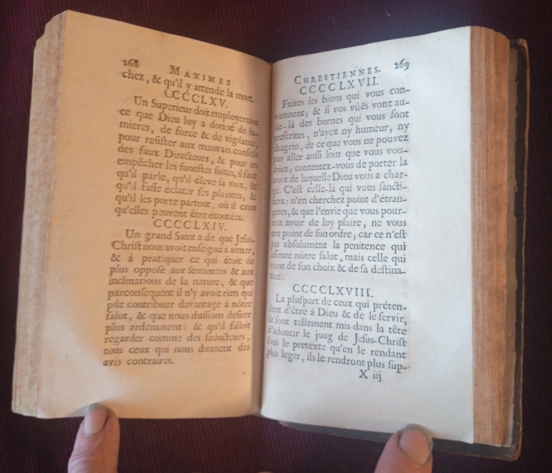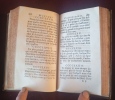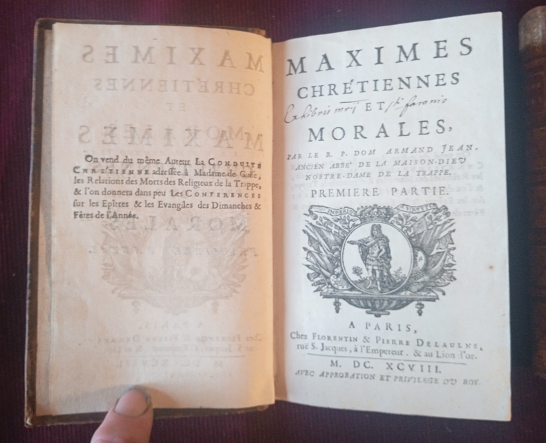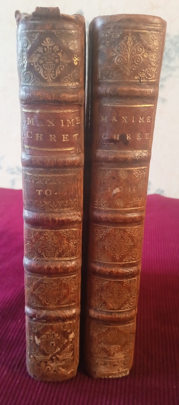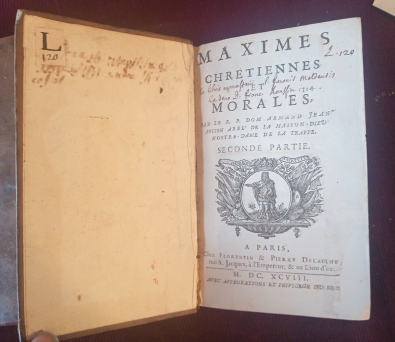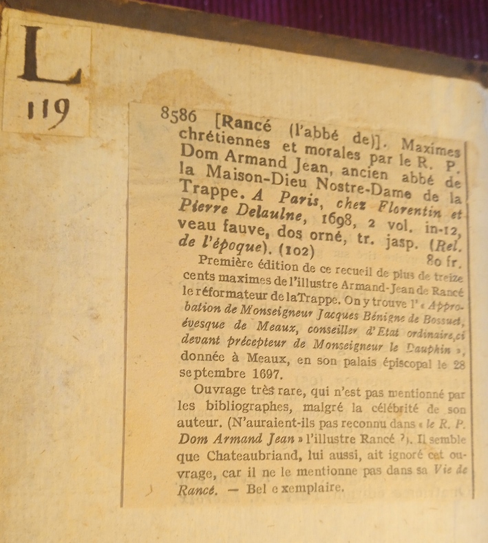 Rare exemplaire de l'édition originale, 2 volumes, in 12, veau fauve d'époque, 5 nerfs, dos orné, approbation et privilège, 384 p. et 375 p. + table, beaux exemplaires, coiffe de tête du premier volume coupée, celle de pied du second frottée, manques de cuir sur 3 coins. Bien que réalisées à l'époque, les reliures sont légèrement différentes par leurs ornements, celle du tome 1 à une armoirie d'alliance sous couronnes ducales à ce qu'il me semble, celle de gauche portant une fleur de lys, celle de droite illisible). Je reprend le descriptif collé à l'intérieur du premier plat du T. 1 provenant du catalogue d'un vendeur de la fin du dix-neuvième siècle ou du début du vingtième : Première édition de ce recueil de plus de treize cent maximes de l'illustre Armand-Jean du Rancé le réformateur de la Trappe. On y trouve l'"Approbation de Monseigneur Jacques Bénigne, évêque de Meaux, conseiller d'Etat ordinaire et devant précepteur de Monseigneur le Dauphin", donnée à Meaux, en son palais épiscopal le 28 septembre 1697. Ouvrage très rare, qui n'est pas mentionné par les biographes malgré la célébrité de son auteur. (N'auraient-ils pas reconnu dans le "R.P. Dom Armand-Jean" l'illustre Rancé ?). Il semble que Chateaubriand, lui aussi, ait ignoré cet ouvrage, car il ne le mentionne pas dans sa Vie de Rancé.