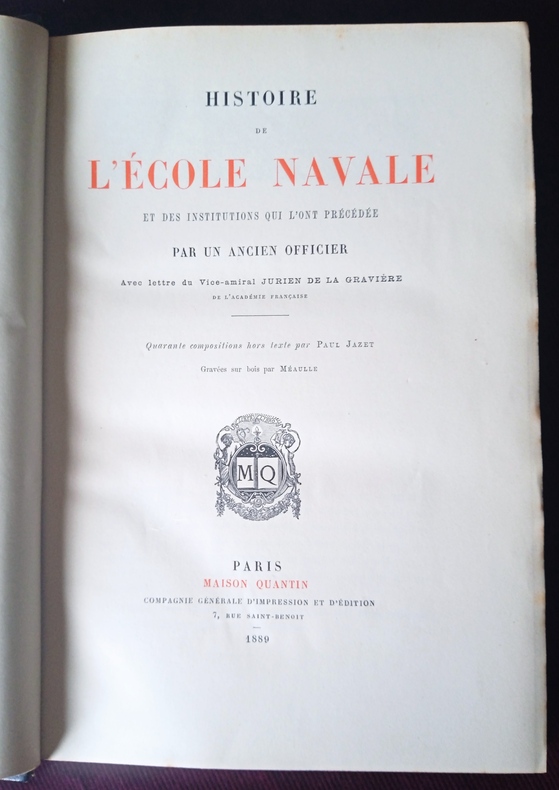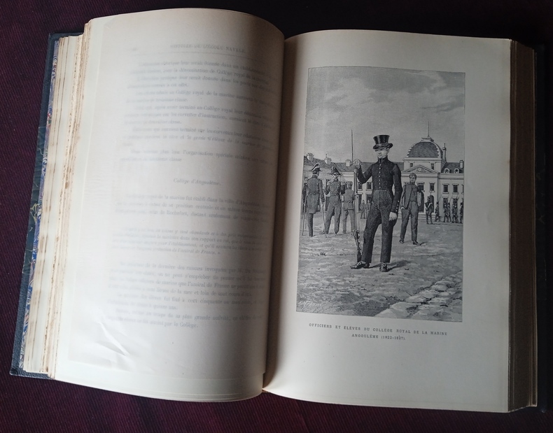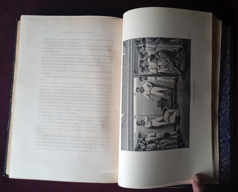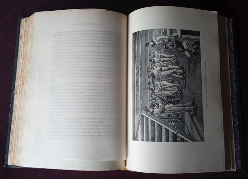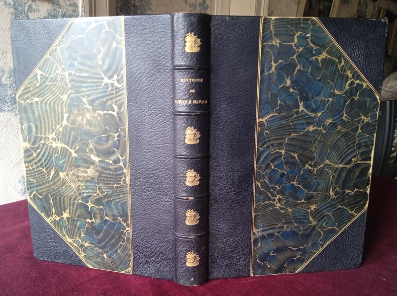 Bel exemplaire, reliure demi maroquin à coins, 5 faux nerfs, fers dorés représentant des navires sous voiles, tranche supérieur dorée, très légères traces d'épidermures en coiffes, coins et sur un faux nerf, papier des bords un peu frotté aux bords grand format, intérieur en bel état, 366 p.