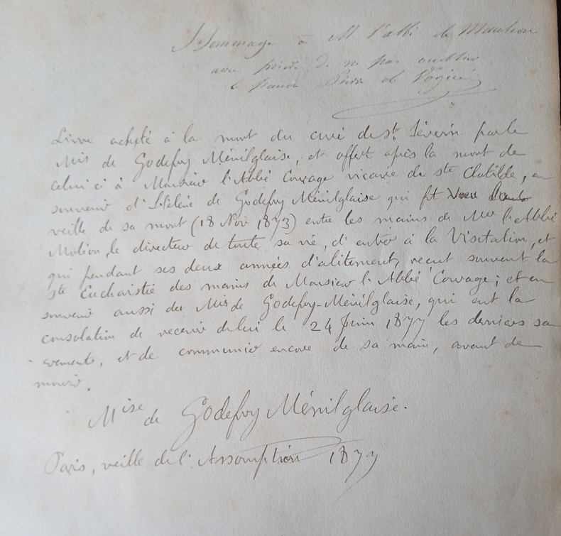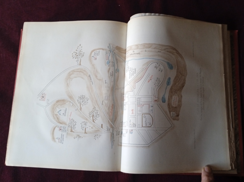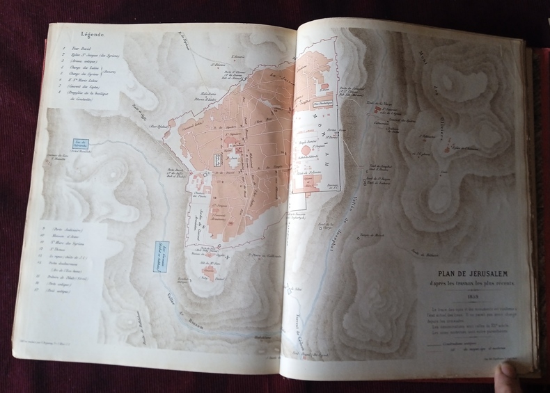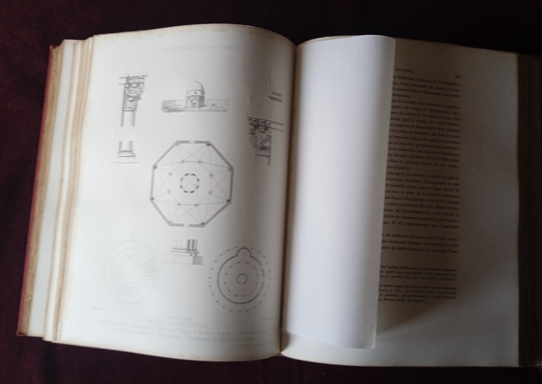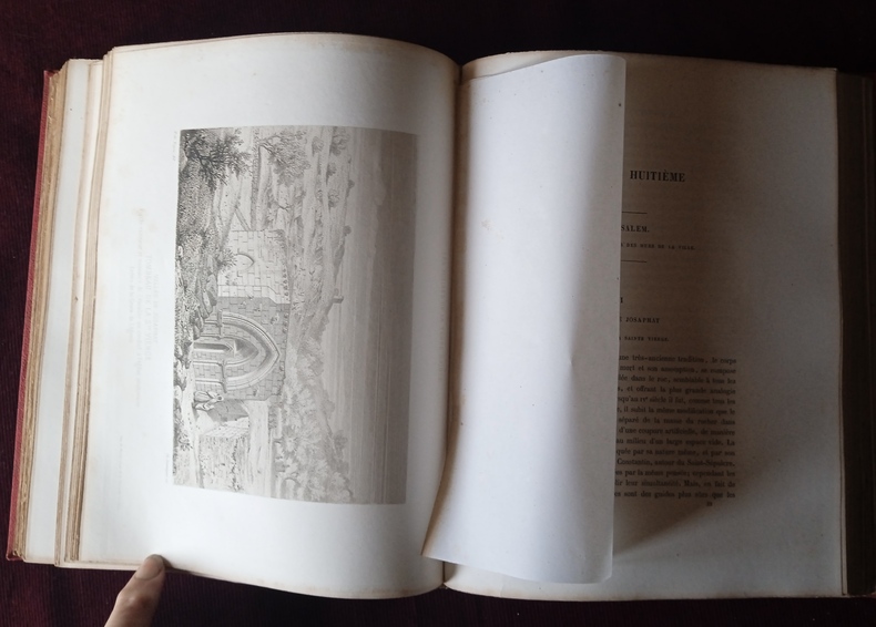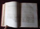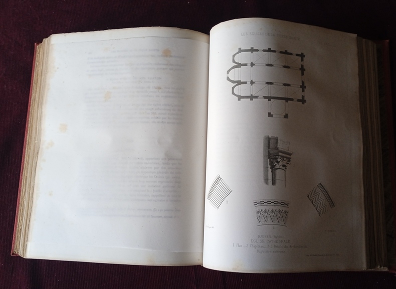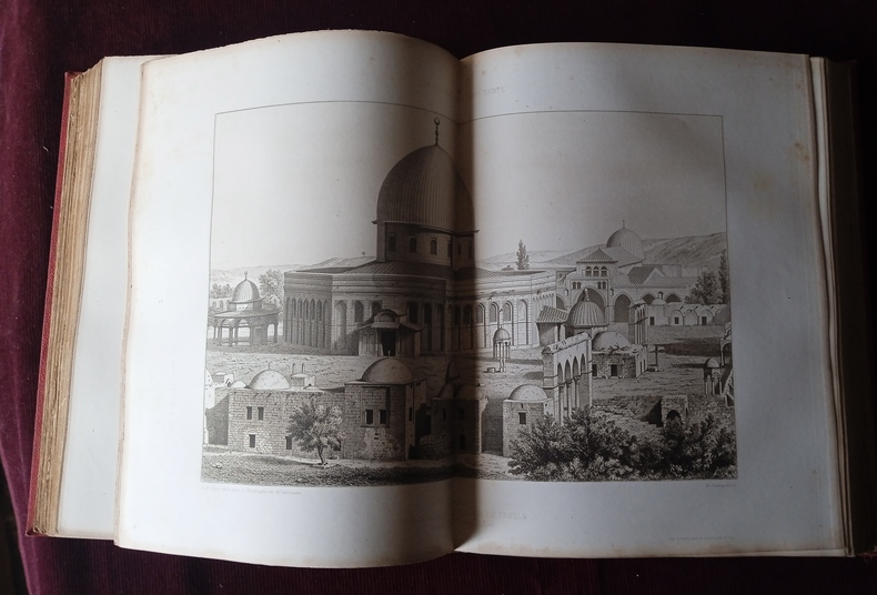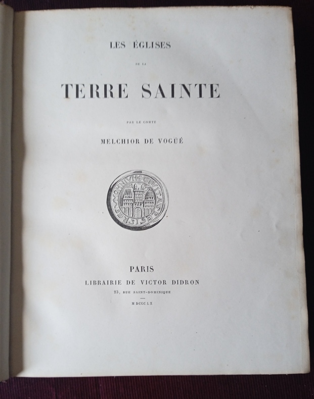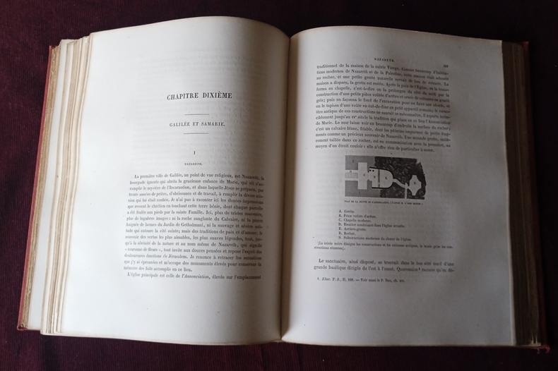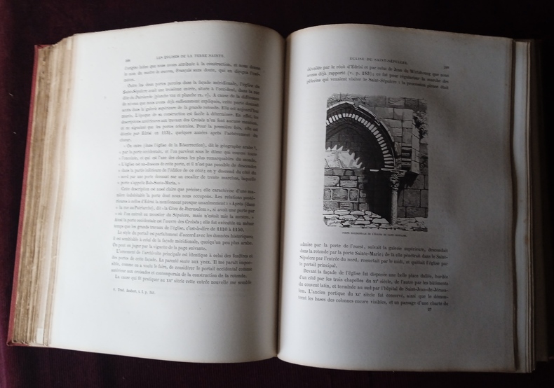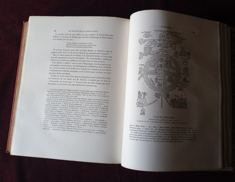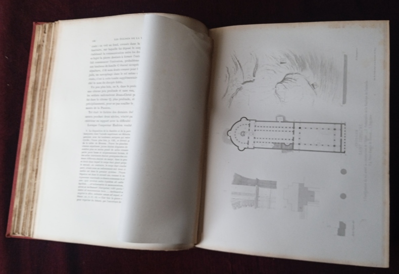 Avec 23 planches de gravures sur cuivre (dont double pages) sous serpentes, 23 gravures sur bois et deux chromolithographies en fin de volumes. Reliure demi maroquin, 5 faux nerfs, fente de 4 cm en pied de mors du second plat, une fente de 1 cm au niveau de la coiffe inférieure, très légères traces d'épidermure sur les mors, percaline sur les plats un peu frottée sur les coins, in-4°, intérieur en bonne condition, rousseurs assez éparses, p. de faux titre, p. de titre, double planche formant frontispice, 463 p. errata. Sur la première garde, intéressant suivi de cet exemplaire au u troisième quart du vingtième siècle commençant par un ex-dono de Pierre de Vogüé (un cousin de l'auteur) à un prêtre de la paroisse de Saint Séverin puis son entrée dans la bibliothèque du marquis de Godefroy de Ménilglaise puis de son don à un vicaire de la paroisse de Sainte Clotilde.