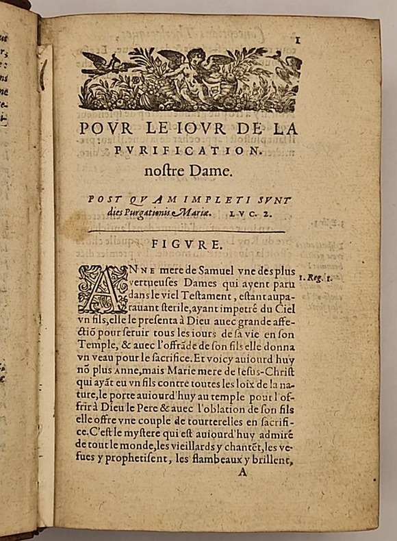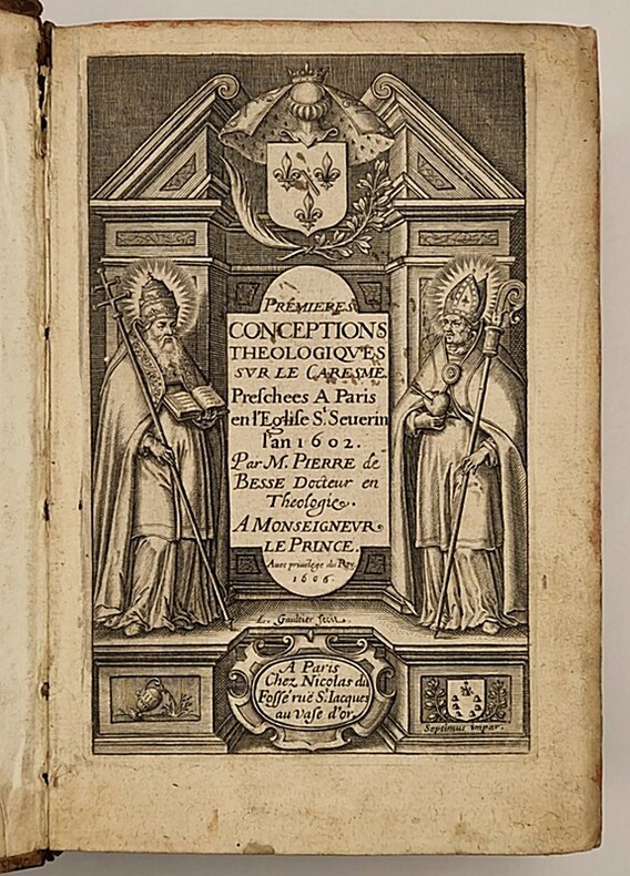 Paris, Nicolas du Fossé, 1606 ; petit et fort in-8° relié plein veau de l'époque (très frotté, petites fentes au mors supérieur des deux plats sur deux centimètres, sans fragilité), dos à nerfs (coiffe supérieure absente), tranches rouges, bandeaux et culs-de-lampe, (16)-1043-(58) pp. Beau titre-frontispice de Léonard Gaultier et portrait du Prince Henry de Bourbon, Prince de Condé. Pierre de Besse (1567-1639) fut le prédicateur de Louis XIII et l'un des plus réputé de son temps, avant que d'autres, comme Bossuet ne l'éclipsassent. Il est l'un des premiers prêtres a prêcher en langue vernaculaire, dans l'église Saint-Séverin de Paris.