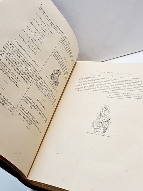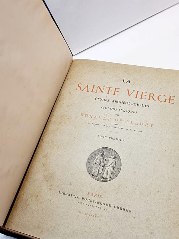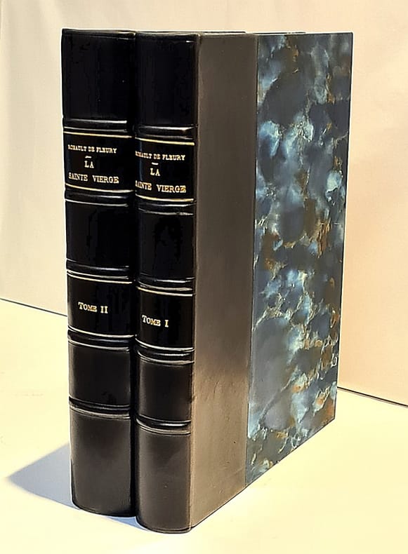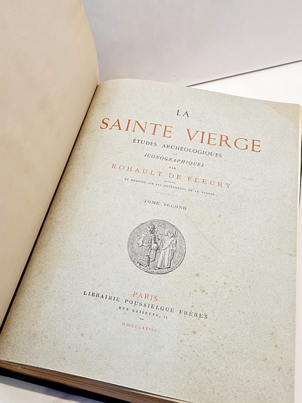 ROHAULT DE FLEURY CharlesLa Sainte Vierge. Etudes archéologiques et iconographiques [2 volumes]Paris, Poussielgue, 1878, 26 x 33 cms, 2 tomes en 2 volumes, broche (légèrement défraichies), intérieur frais. XXXIX, 442, 620 pp., avec quelques illustrations dans le texte, imprime sur papier verge, bien frais.Tome I : la vie terrestre de Marie & sur la vie glorieuse et culte de Marie, tome II : les sanctuaires et images.Bien rareLes envois hors de la France métropolitaine sont payants