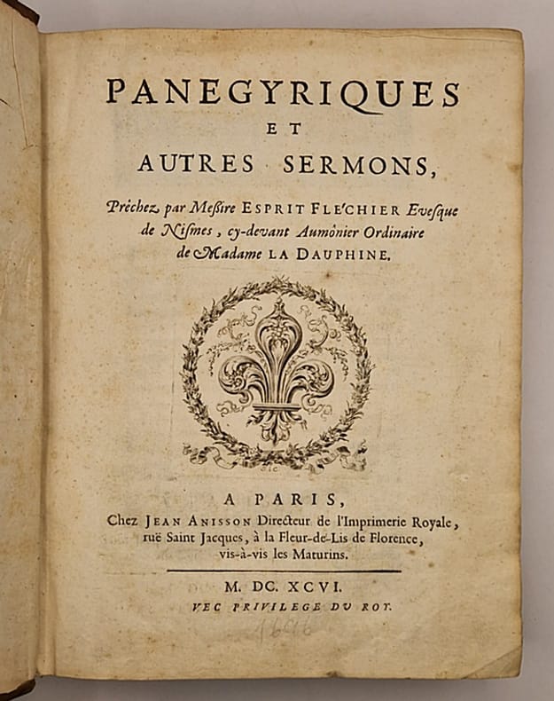 Paris, Jean Anisson, 1696 [édition originale] ; in-4° relié plein veau de l'époque (coins et champs usés par endroits, quelques griffures et menus défauts sur le second plat), dos à nerfs richement orné (coiffe supérieure absente, coiffe inférieure ébréchée et petit accroc au dernier caisson), tranches mouchetées de rouge, portrait-frontispice d'Esprit Fléchier absent, grande vignette de titre gravée en taille-douce, grands bandeaux gravés (dont un historié), culs-de-lampe et lettrines, (30)-440-239 pp. Grande fraîcheur intérieure. L'ouvrage contient entre autres les panégyriques d'Ignace de Loyola, sainte Thérèse, saint François Xavier, saint Philippe Néri, saint François de Sales, plusieurs sermons pour l'ouverture des États du Languedoc, etc., et une suite de sermons prêchés en des occasions particulières.