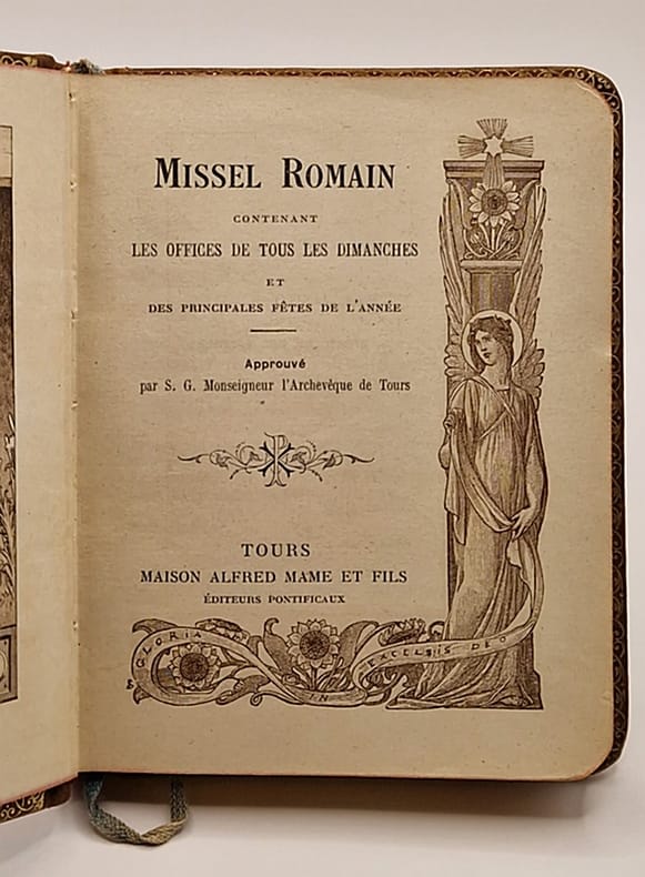 Alfred Mame & Fils, Tours. 1896. In-18. Relié plein cuir. Etat d'usage, Couv. convenable, Dos à nerfs, Intérieur acceptable. 543 pages. Gravure en noir et blanc en frontispice. Illustré de quelques gravures en noir et blanc sur planches hors texte. Texte encadré de gravures ornementales en noir. Texte sur 2 colonnes, en latin et en français. Titre et filets dorés sur le dos. Cadre ornemental doré sur la couverture. Tranche dorée. Annotation d'époque en page de garde. Frontispice détaché.. . . . Classification Dewey : 262-Ecclésiologie, bréviaires
