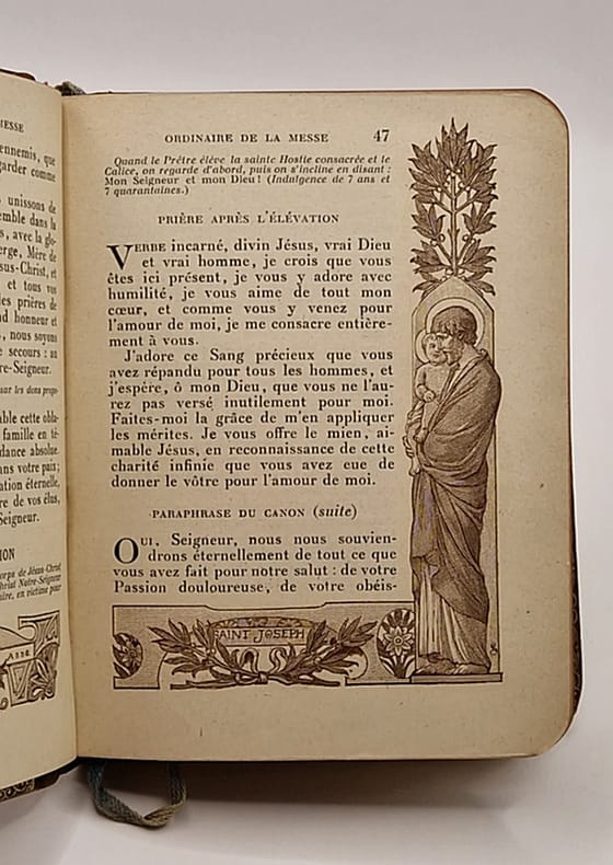 Alfred Mame & Fils, Tours. 1900. In-24. Relié plein cuir. Bon état, Couv. convenable, Dos satisfaisant, Intérieur acceptable. 543 pages. Gravure en noir et blanc en frontispice. Illustré de nombreuses gravures en noir et blanc encadrant le texte et sur planches hors texte. Titre doré sur le dos. Initiales dorées sur le 1er plat (R.B.). Tranche dorée.. . . . Classification Dewey : 262-Ecclésiologie, bréviaires