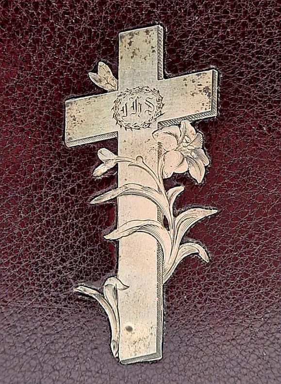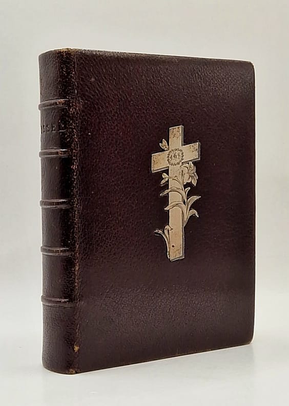 Paris/Lille, Lefort, 1891 ; in-12 relié plein chagrin brun, dos à nerfs, croix et lys d'argent en incrustation au premier plat, tranches dorées, gardes fleurdelisées frontispice, large encadrement en équerre à chaque page, texte latin-français, sur deux colonnes, 591 pp.
