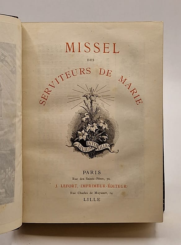 J. Lefort, imprimeur, éditeur, A. Taffin-Leffort, Successeur Relié sous emboîtage 1891 In-12 (12 x 15,2 cm), reliure plein chagrin, dos à 5 nerfs, fleurs de lys et filets dorés aux plats et au dos, roulette dorée aux contreplats, tranches dorées, 591 pages, texte encadré de dessins et ornementations, ce missel est contenu dans une boîte à fermoir noire ; frottements aux angles et arêtes de la boîte, par ailleurs le missel lui-même est en très bon état. Livraison a domicile (La Poste) ou en Mondial Relay sur simple demande.