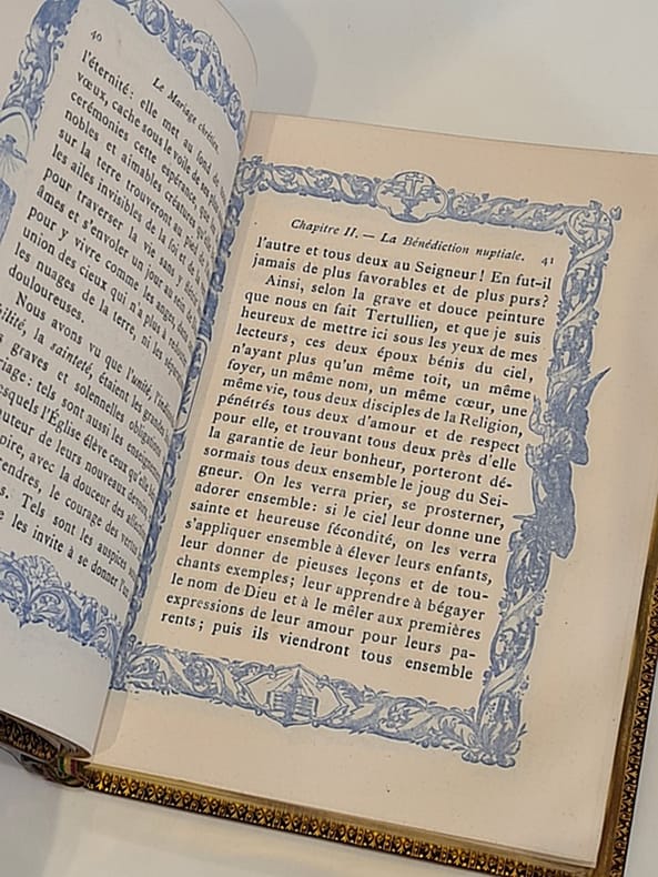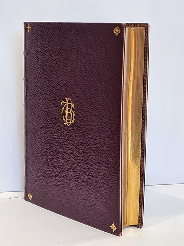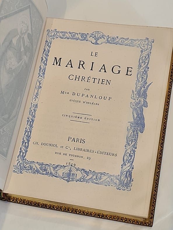 Paris, Charles Douniol, 1879 ; in-12 plein maroquin lie-de-vin, dos à nerfs orné, reliure signée en pied « Lesort » ; plats ornés de quatre écoinçons et plat supérieur marqué d'initiales dorées, roulette dorée encadrant les gardes, tranches dorées, frontispice et titre-frontispice ; encadrement bleu ciel à chaque page, 400 pp. Bel exemplaire.
