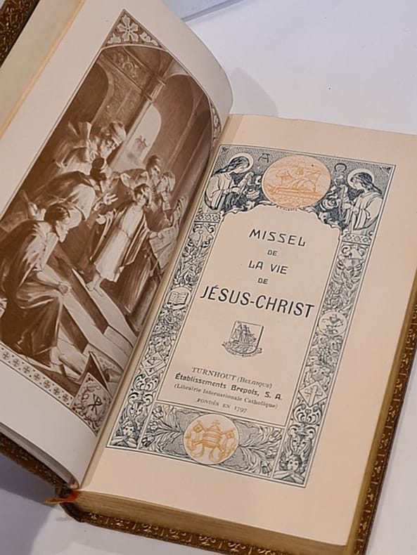 2. Turnhout, établissements Brepols, s.d. (approbatio 1948), in-12°, 13 x 8 cm, 320 pp, all pages printed with an elaborately illustrated border, bound in cream coloured imitation ivory, large supra-libro (a cross and a gilt dove). All edges gilt. Nicely preserved copy of a liturgical book which served to attend the Roman Catholic Mass. Text in French..