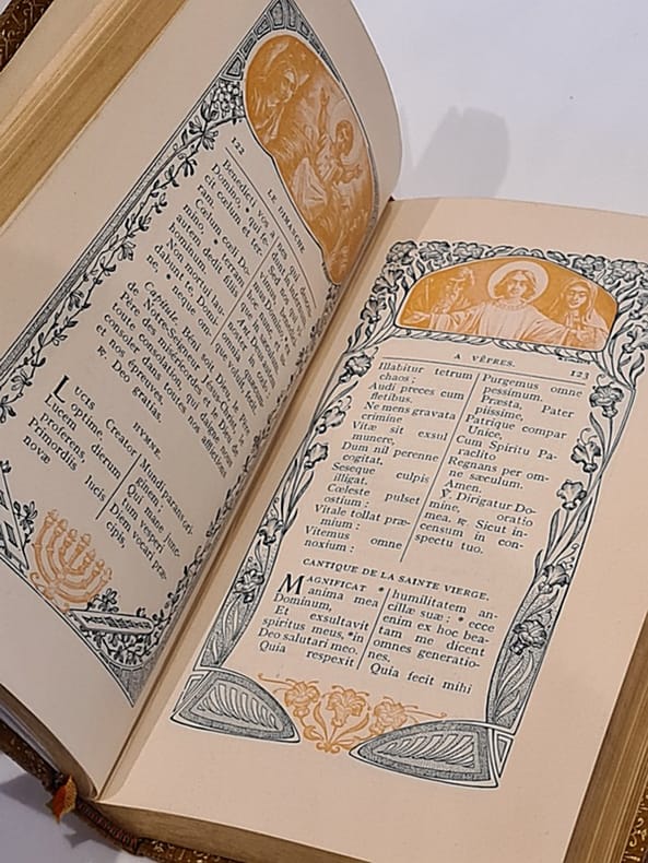J & L Beuzon Etablissements Brepols reliure Rigide Décorative Turnhout 1905 508 pages en format 9 - 12 cm - chaque page a un encadrement décoratif avec illustration en vignette - reliure rigide en cuir brun avec décoration et titre en dorure - plats en repoussé avec dorures - tranches dorées - TBE