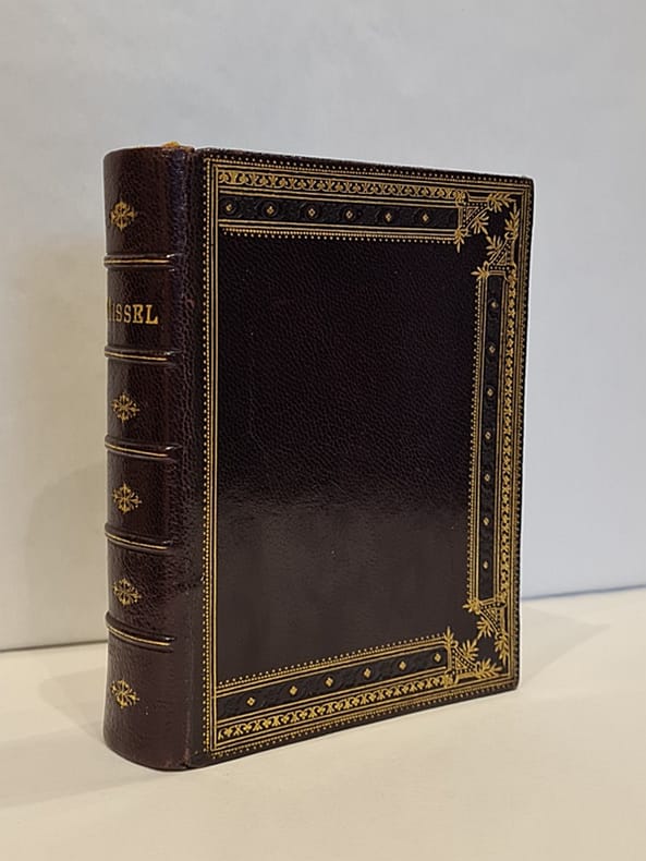 Limoges, Marc Barbou, 1894 ; in-12 relié plein maroquin brun, dos à nerfs orné, plats ornés d'encadrements dorés, tranches dorées, gardes bordées de dorures, frontispice et titre-frontispice, encadrements à chaque page, 2 gravures, 448 pp.