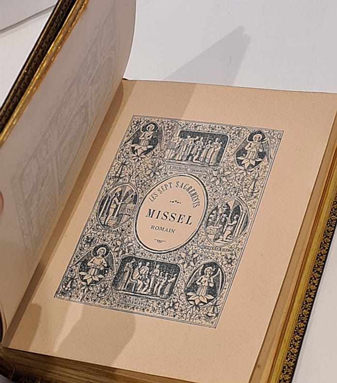 Paris - Limoges J. Depelley & Cie, Editeurs, sans date (fin XIXème) in 12 (15x11,5) 1 volume reliure plein maroquin vert de l'époque, dos lisse, dentelle dorée intérieure, double filet doré sur les coupes, tranches dorées, faux-titre, frontispice, titre, et 200 pages ornées d'un encadrement varié en chromolithographie avec rehauts dorés (imprimerie J. Depelley et Cie, Limoges), petites éraflures sur le plat supérieur. Bel exemplaire ( Photographies sur demande / We can send pictures of this book on simple request )