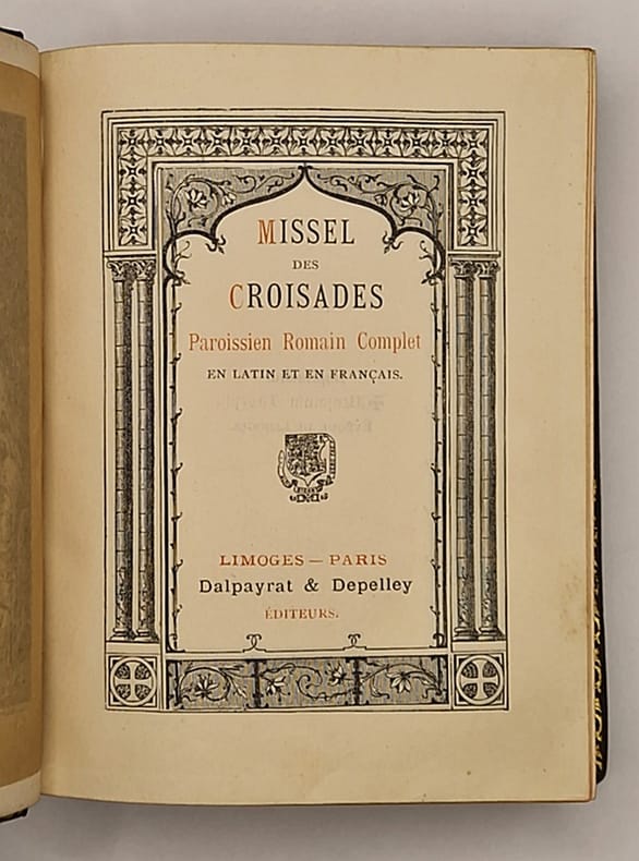 Limoges/Paris, Dalpayrat et Depelley, 1901 ; in-12 relié plein maroquin prune, dos à nerfs, rebords des plats festonnés, tranches dorées, roulette intérieure,gardes de moire rouge, frontispice et titre-frontispice, 3 planches hors texte, chaque page encadrée de motifs en équerre représentant des scènes des croisades, texte latin et français sur deux colonnes, 504 pp.