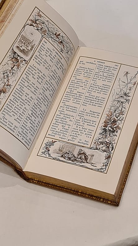 Dijon, Roux-Marchet, 1909 ; in-12 relié plein maroquin brun, dos plat (pied insolé), monogramme métallique sur le plat supérieur, tranches dorées, gardes de moire vert sapin, roulette intérieure dorée, frontispice, titre-frontispice, prière encadrée ou vignette au bas du verso de chaque page, large encadrement en équerre historié en belle page, 512 pp.
