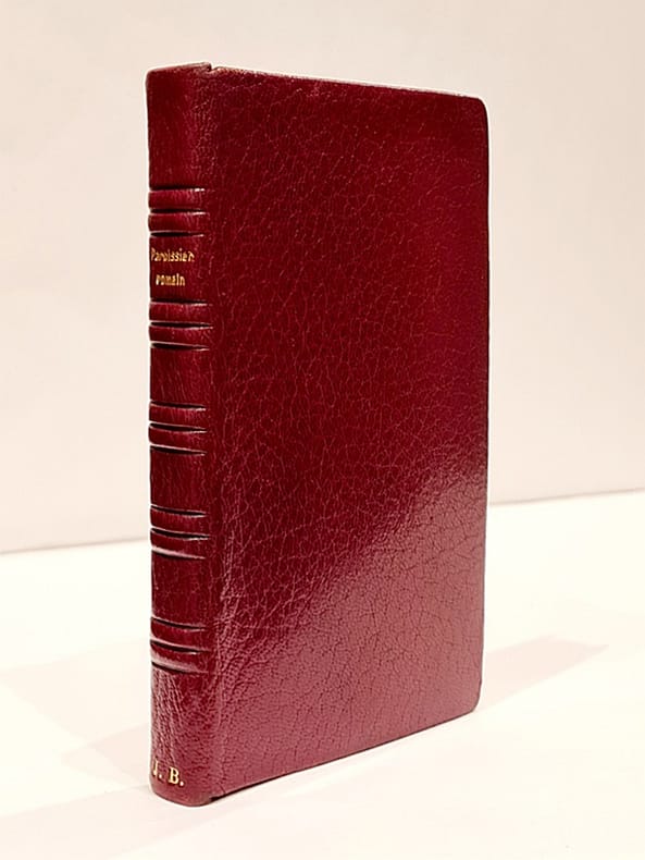 Lille, J. Lefort, 1905 ; in-16 relié plein veau glacé, dos à nerfs ornés, encadrement de double filet doré et d'un décor estampé sur le premier plat, champs ornés, tranches dorées, gardes de moire marron (en partie collées aux plats) frontispice, large encadrement en équerre sur chaque page, 386 pp.