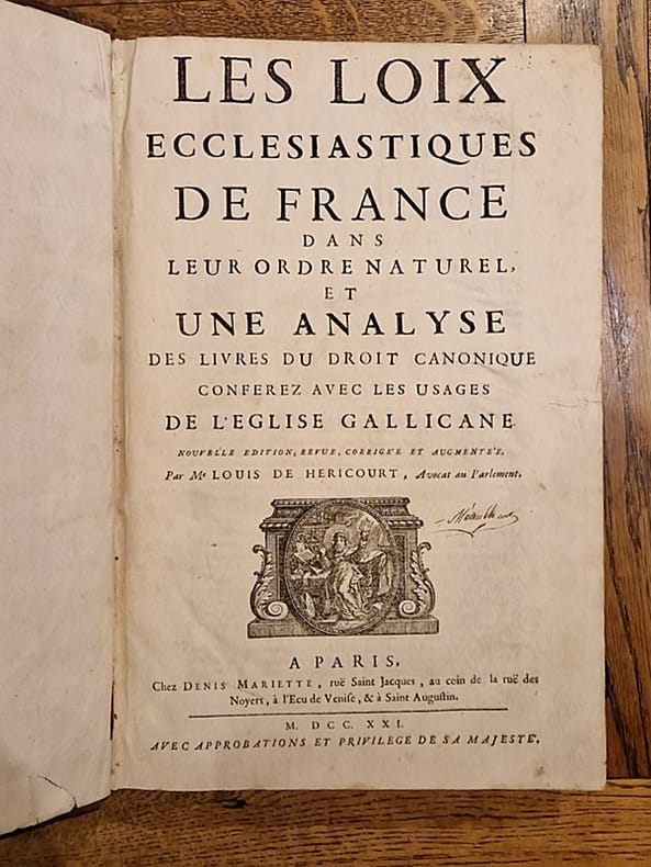 Paris, Denis Mariette, 1721 ; in-folio relié pleine basane brune de l'époque, dos à nerfs richement orné, (coiffes ébréchées, deux mors fendus sur 3 cm, sans fragilité), bandeaux et culs-de-lampe gravés, texte sur deux colonnes ; titre, 10 pp. (Préface et Table), 739 pp., 8 pp. (Tables de l'Analyse), 168 pp. (Analyse du Décret de Gratien). Bon exemplaire, grande fraîcheur intérieure.