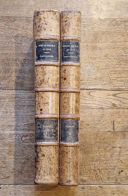 Typis Cartusiae Sancta Maria de Pratis, 1884 ; deux in-folio reliés demi-chagrin grenat à larges coins, dos à cinq nerfs richement orné (dos légèrement frotté par endroits), culs-de-lampe, texte sur deux colonnes avec, en marge, quelques indications à usage liturgique, 749 et 600 pp. Complet.