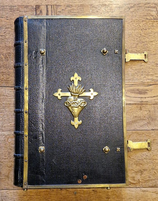 Westmalle, Ex Typographia Cisterciensium Reformatorum, 1903 ; grand et fort in-4° relié plein cuir (hauteur : 51 cm, largeur : 34 cm, épaisseur : 10 cm, 12 kg), cornières, cabochons et fermoirs métalliques, grand médaillon au centre du plat supérieur, en relief, représentant le Sacré-Coeur de Jésus sur le plat supérieur, tranches rouges, 540-286* pp.