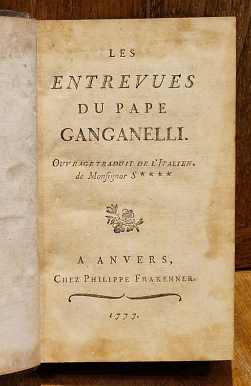 Contient les Entrevues : avec Saint-Ignace de Loyola ( mort de Clément XIV,. son exaltation. destruction de la Société des Jésuites) - avec Sixte V ( comparaison des deux pontifes) - avec l'Abbé de Lignac (examen d'une hypothèse sur la présence simultanée du même homme en plusieurs lieux différents) - avec Scot & Bannés ( critique de la théologie scholastique et projet de réforme) - avec Sainte-Thérèse ( censure de quelques lettres attribuées à Clément XIV, lesquelles ont pour objet la dévotion, les ordres religieux, etc) - avec M. Anthropole, négociant ( " traite des nègres") - avec Lemos ( Système de la grace. régles qu'il faut observer dans le choix des opinions)- avec Simplicius, prêtre d'Afrique (nécessité d'étudier la religion de manière à se convaincre qu'elle est véritable) - avec M. Méad, médecin ( idée de la vraie liberté des arts libéraux. réfutation d'un livre intitulé "medica sacra") - avec M. Berclay, anglais ( monde intelligible) - avec Grégoire VII et la Comtesse Mathilde ( indépendance des Souverains) - avec M. Vazoni, directeur de religieuses. Concorde du célibat et de la population).Ouvrage apocryphe. Par Guill.-André-René Baston, d'après Barbier.(GrG)