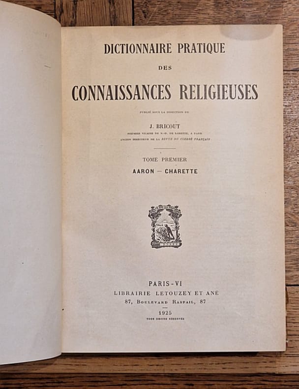 Letouzey & Ané Dictionnaire pratique des connaissances religieuses Broché 1930 In-4, (28x20 cm), broché, paginé 259-511, non coupé, publié sous la direction de J. Bricout, écriture sainte ; apolocétique ; théologie dogmatique, morale, ascétique et mystique ; liturgie ; droit canonique ; droit civil ecclésiastique ; droit des gens ; histoire des religions ; histoire et géographie ecclésiastiques ; patrologie ; hagiographie ; philosophie ; questions politiques, économiques et sociales ; instituts religieux ; oeuvres catholiques ; éducation ; prédication ; pratique pastorale ; sciences ; occultisme ; littérature ; arts d'église ; musique sacrée ; plats insolés, rousseurs, pliures sur le dos, assez bon état. Livraison a domicile (La Poste) ou en Mondial Relay sur simple demande.