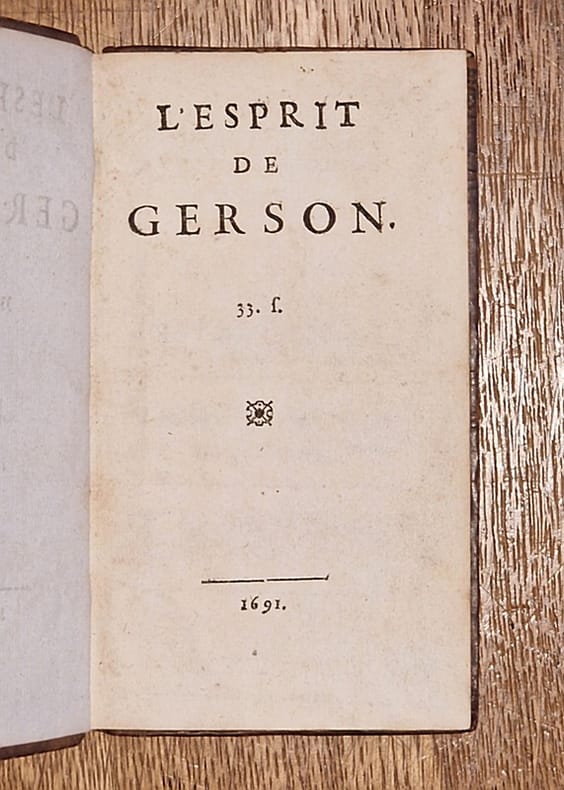 ''Cet ouvrage fut fait pour la défense des immunités, privilèges, libertés des ambassadeurs de France à Rome, où elles leur étaient contestés par le gouvernement pontifical. Jean Charlier, docteur de Sorbonne, connu sous le nom de Gerson, village du diocèse de Reims où il naquit en 1363, fit ses études à Paris. Il assista aux conciles de Pise et de Constance et y eut une grande influence. Il mourut à Lyon, en 1429. Quelques auteurs l'ont regardé comme le véritable auteur de l'Imitation de Jésus-Christ.'' (in Gay). Favorable à la voie de cession puis avocat de la cause conciliaire, Gerson fut l'un des principaux théologiens du Concile de Constance (procès de Jan Hus) de 1415 et un acteur important de la fin du schisme. Il est notamment connu pour son projet de «retour à la foi pure», son engagement au service d'une vulgarisation du dogme et sa théorisation de la théologie mystique dans la lignée du Pseudo-Denys l'Aréopagite et de saint Bonaventure. Son travail intellectuel sera marqué notamment par le combat contre le néo-platonisme et la logique de Duns Scot. Sa postérité se mesure aussi bien chez des penseurs réformés, Luther, Calvin que chez des penseurs catholiques tels que saint François de Sales. Lettré de premier ordre, il appartient au groupe du premier humanisme français aux côtés de Nicolas de Clamanges, Jean de Montreuil, Gontier et Pierre Col. Il est un des témoins du renouveau de la rhétorique et de l'ouverture aux conceptions littéraires en provenance de l'Italie (tel Pétrarque). Barbier I, Dictionnaire des ouvrages anonymes, 451-d - Quérard V, La France littéraire, p. 161 - Gay, Saisie des livres prohibés faite au couvent des Jacobins et des Cordeliers à Lyon, en 1694. Légère décoloration en tête du second plat. Infimes marques d'usage affectant par ailleurs la reliure. Petite cerne affectant les fonds de cahiers de la première moitié de l'ouvrage. Du reste, bonne condition.