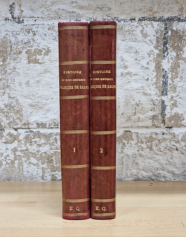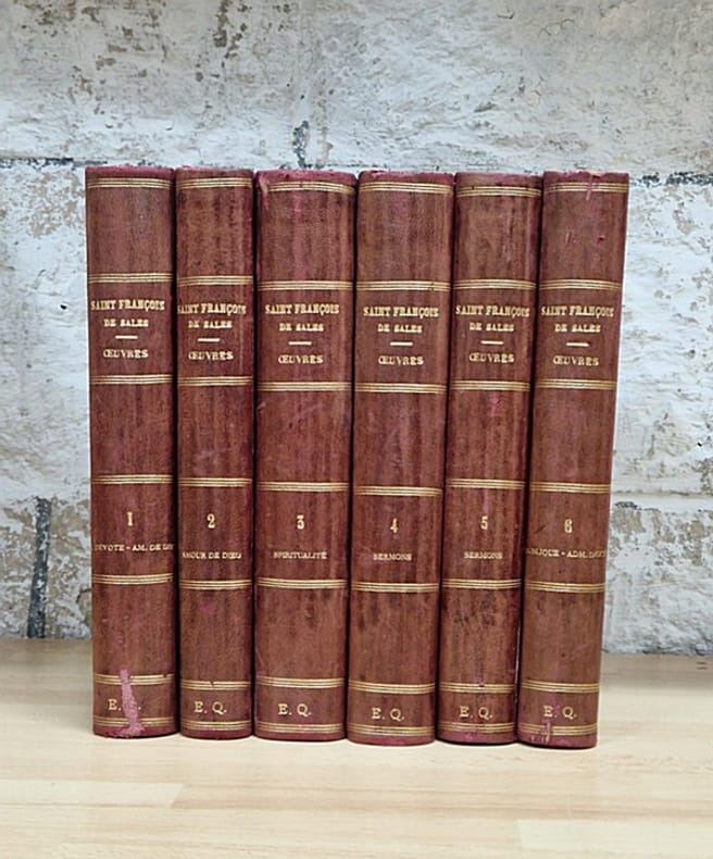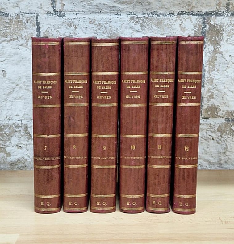 Paris, Louis Vivès, 1862 ; 12 vol. in-8° reliés demi basane rouge (petites épidermures au dos de deux volumes), dos plat. Complet. Les oeuvres complètes en douze volumes sont ici accompagnées de l'« Histoire du bien-heureux François de Sales » composée par Charles Auguste de Sales, publiée à Paris chez Louis Vivès en 1857, en deux volumes dans la même reliure.