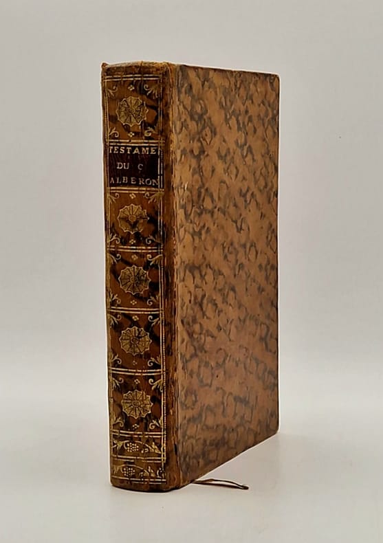Édition originale. Ce testament est apocryphe. Parfois attribué à Durey de Morsan, on parle plus souvent de Maubert de Gouvest. Ce personnage est un des plus singuliers aventuriers du XVIII° siècle. Il naquit à Rouen en 1721. Pris d'une ferveur religieuse à son adolescence, il se fit capucin. En 1745 il sentit qu'il s'était trompé de vocation et s'enfuit du couvent pour se réfugier en Hollande. On le retrouve plus tard officier d'artillerie en Allemagne. Il quitta son costume militaire pour se charger de l'éducation du fils de son général. De vagues activités d'espionnage lui valurent d'être enfermé dans la forteresse de Königstein dans le Taunus, où il se livra à des travaux d'écriture. Il fut relâché en 1752 grâce à l'intervention du nonce apostolique qui l'obligea à reprendre sa robe de capucin à Rome. Il s'enfuit à nouveau pour Mâcon, Genève et Lausanne où il se mit à publier des ouvrages qui furent tous saisis. Alors il se fit protestant. On le retrouve ensuite à Londres dans l'entourage de Bolingbroke, mais il se compromit dans de nouvelles affaires d'espionnage. Sa vie fut alors une succession de fuites, d'emprisonnements en Hollande, en Allemagne. Il mourut à Altona en 1767 à peine âgé de 46 ans. On lui doit une falsification détestable de La Pucelle de Voltaire publiée en Hollande. Ce Testament, forme historique alors à la mode, est conçu sur le plan de ceux de Richelieu, Mazarin, Colbert ou Louvois. Voltaire en fit l'éloge. (Cioranescu II, 43787 - notice de Quérard in supercheries I, 233). Quérard décrit longuement les deux attributions d'après Gaullieur et Auguis. Quant à Alberoni (1664-1752), agent du duc de Parme, il joua un rôle important dans les affaires de la Succession d'Espagne avant de devenir ministre de Philippe V. - Coiffes frottées, reliure un peu épidermée, intérieur frais.