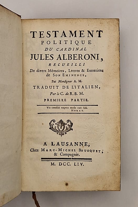 Lausanne, Marc-Michel Bousquet, 1754 ; deux parties reliées en un in-12 plein veau glacé de l'époque, dos lisse richement orné, pièce de titre rouge, tranches marbrées, XXXI-174-291 pp. Bel exemplaire. Le cardinal Alberoni (1664-1752) repose à Plaisance dans l'église du collège San-Lazzaro appelé aujourd'hui San-Lazzaro-Alberoni.