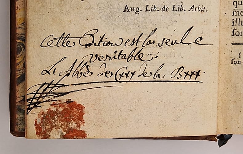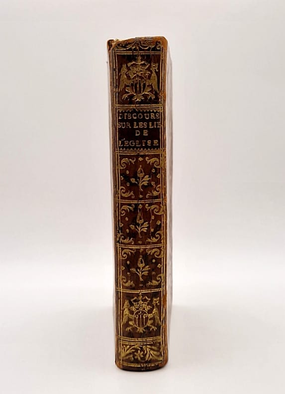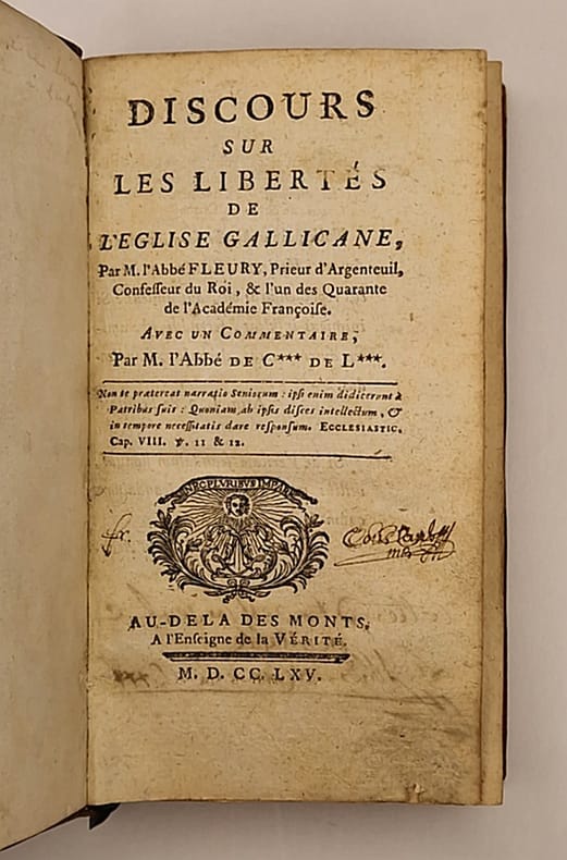 Au-delà des Monts, À l'Enseigne de la Vérité, 1765 [édition originale de cette version commentée par l'abbé Chiniac de la Bastide] ; in-12 relié pleine basane de l'époque, dos à nerfs richement orné, pièce de titre rouge, tranches rouges, ex-libris; XII-480 pp. Annotation manuscrite au verso de la page de titre : « Cette édition est la seule véritable. L'Abbé de Cxxx de la Bxxx. »