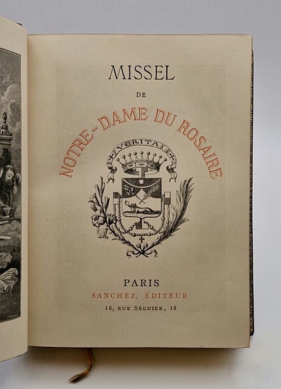 Sanchez. 1887. In-16. Relié plein cuir. Bon état, Coins frottés, Dos satisfaisant, Papier jauni. 507 pages. Titre, filets et fleurons en doré au dos+ 5 nerfs. Tranches dorées. Signet conservé. Frontispice illustré en noir et blanc. Pages illustrées en noir et blanc, dont certaines gravures sous serpente. Texte en latin et français.. . . . Classification Dewey : 260-Théologie sociale chrétienne