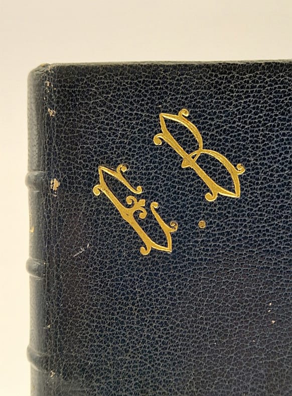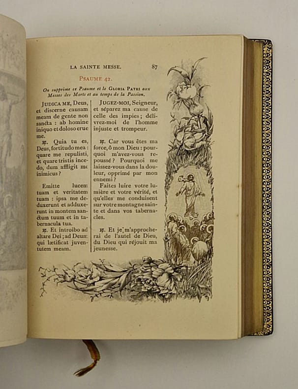 Couverture rigide. Reliure plein maroquin brun, dos à nerfs, tranches dorées, gardes de soie moirée violine, roulette intérieure. Chaque page est encadrée d'un décor aux motifs de fleurs, d'animaux et de scènes bibliques. 507 pages.
