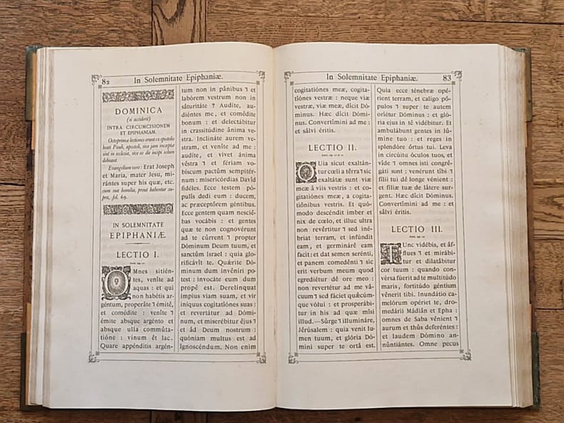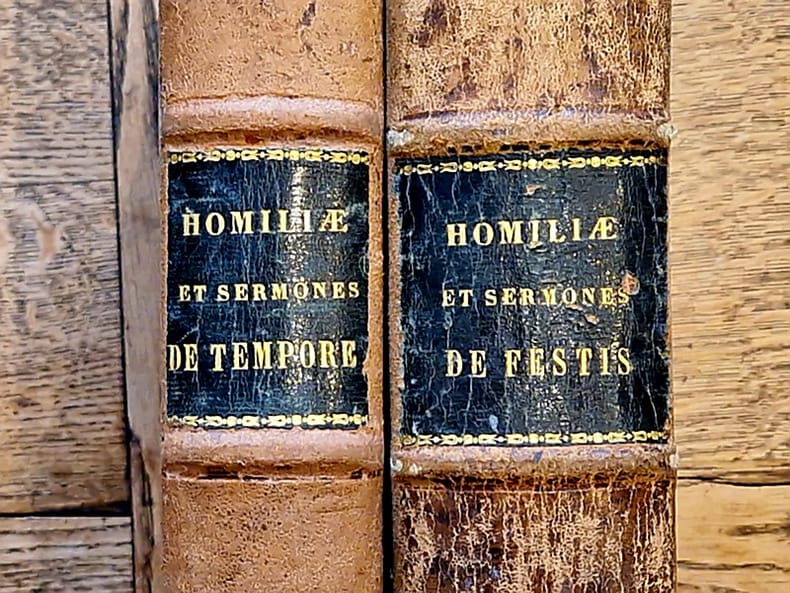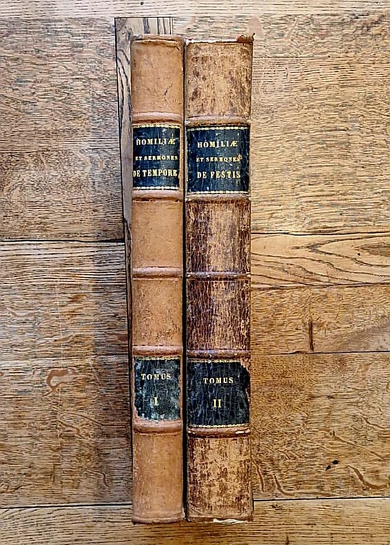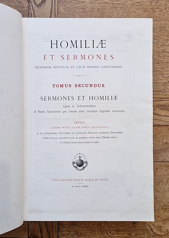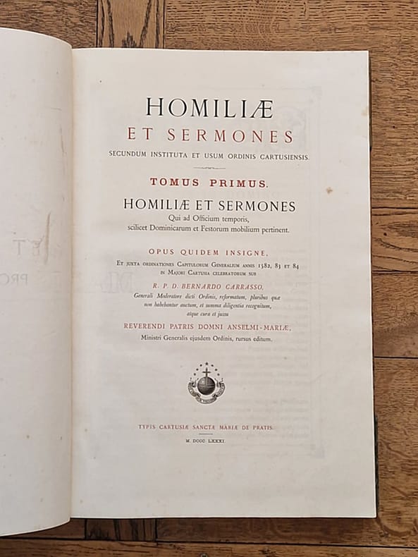 Cartusiae Sanctae Mariae de Pratis, 1881 ; 4 tomes reliés en 3 forts in-folio pleine basane, dos à nerfs – pièces de titre noires et cornières métalliques aux coins des deux premiers volumes – reliures défraîchies mais solides, bon état intérieur, bandeaux, culs-de-lampe et lettrines, quelques rares annotations d'adaptation manuscrites dans les marges; texte sur deux colonnes. Ouvrage peu courant en état d'usage.
