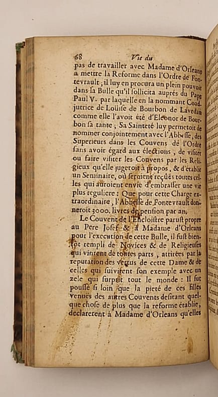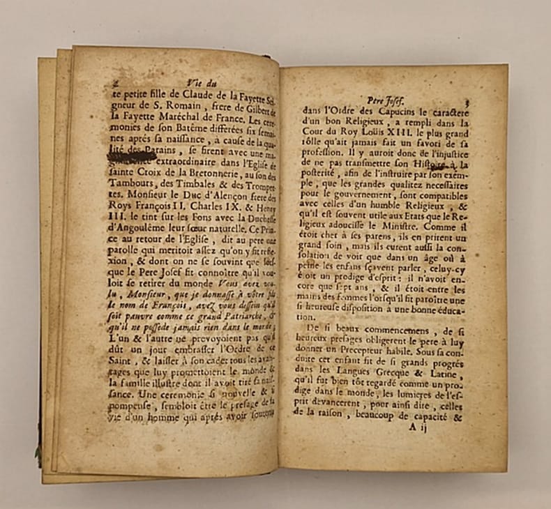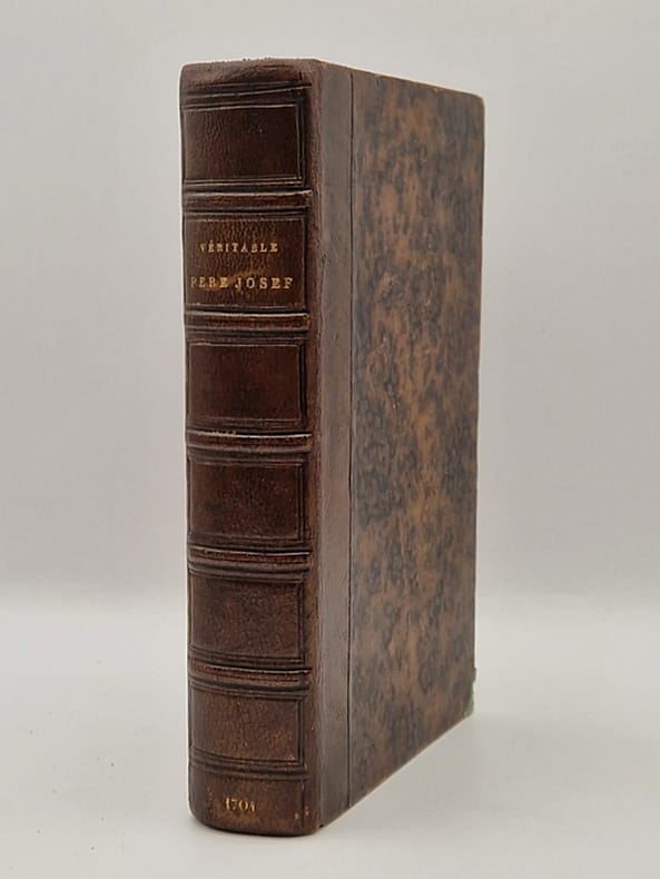 Saint-Jean-de-Mauriene, Gaspard Butler, 1704 ; in-12 relié demi basane brune (reliure postérieure, coins usés), dos à nerfs, « 1704 » en caractères dorés en pied, tranches jaspées, bandeaux et culs-de-lampe, taches d'encre noire pp. 1-3 et 586-587, taches claires pp. 68-69, petit manque de papier p. (6) de la table, (4)-589-(10) pp. François Leclerc du Tremblay (1577-1638), en religion père Joseph, capucin, fut proche du Cardinal de Richelieu.