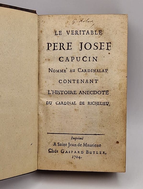 2 ff.n.ch. (titre, préface), 589 pp., 11 pp.n.ch. de table. Le portrait que l'on trouve dans certains exemplaires manque en fait la plupart du temps et son appartenance à l'intégrité de l'ouvrage est problématique.Deschamps, 817, retient notre ouvrage comme première production de presses de Saint-Jean-de-Maurienne, mais l'impression est certainement parisienne.Quérard VIII, 20. Brunet (Gustave), Imprimeurs imaginaires, p. 30. Édition originale de cette biographie polémique de l’éminence grise de Richelieu, le trop célèbre Père Joseph Le Clerc du Tremblay (1577-1638). René Richard (1654-1727), ancien Oratorien, chanoine de Sainte-Opportune à Paris, fut historiographe de France et censeur royal.Exemplaire de Pierre-Charles Delasize, juge au tribunal de Rouen, avec vignette ex-libris contrecollée sur les premières gardes. La vente de son importante bibliothèque eut lieu en 1846 (Cf. Frère I, 191)
